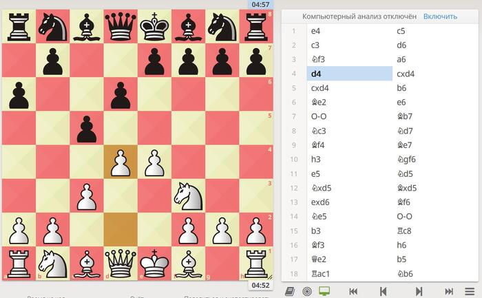 Но тем не менее, давайте все таки рассмотри к чему к 7 ходу привела попытка черных озадачить соперника. Итак белые - Кс3 контролирует центральное поле е4, 3 легкие фигуры в игре, король под защитой, перевес по движку +3. Черные - да, центр под пешечным контролем, но король в центре, без возможности рокироваться, развиты всего 2 фигуры, сложности в выходе коня с b8, да и к тому же следует 7... Сf3 - черные меняют свою развитую фигуру.