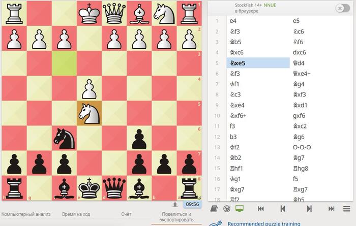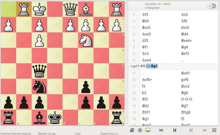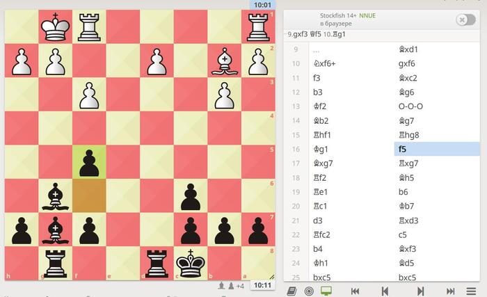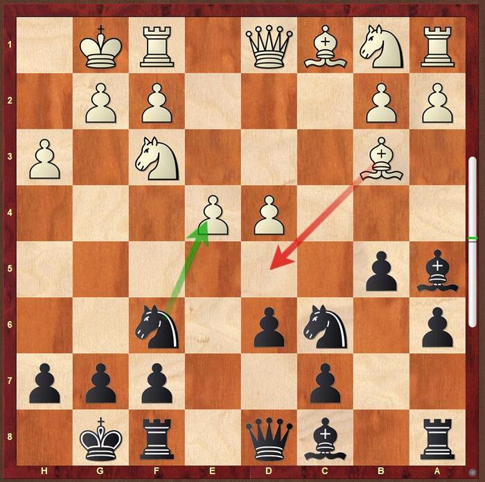 Обратите внимание, что после 2 хода, того самого 2...f6 - движок сразу показывает +2 у белых. Но в партии последовало нескольким по-другому. Не было жертвы коня, а был развит белопольный слон. И почему на 3... d5 последовало взятие пешкой, а не слоном, мой ученик достаточно уверенно обосновал свое видение позиции. Пешка d5 теперь мешает выйти коню на с6, а слон берет по контроль диагональ а6-g8 и с прицелом на будущее развитие в случае рокировки найти выгоду во вскрытом шахе движением пешки d6. Я про себя очень порадовался, т.к. стратегическое планирование течения партии - это отличное умение шахматиста.