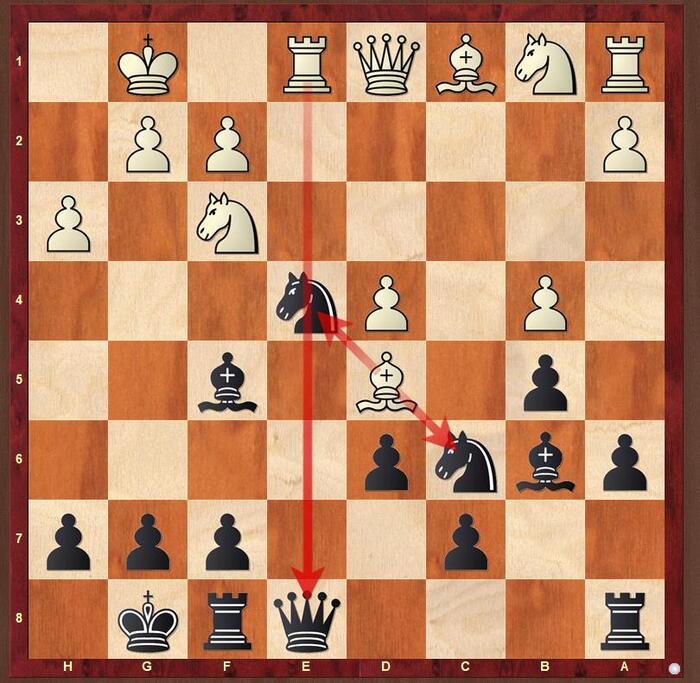 После размена на f3 у белых появлялась интересная комбинация, как видно по стрелкам можно было связав пешку, забрать бесплатного коня, но в партии после коня на d4 было сыграно 8.Фd1 - ход нескольким пассивный, но самое интересное движок ведет его по второй линии.