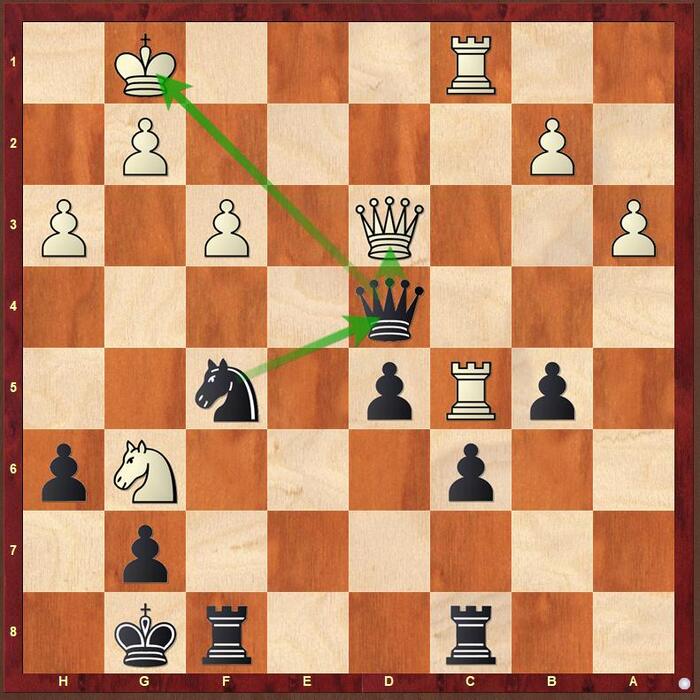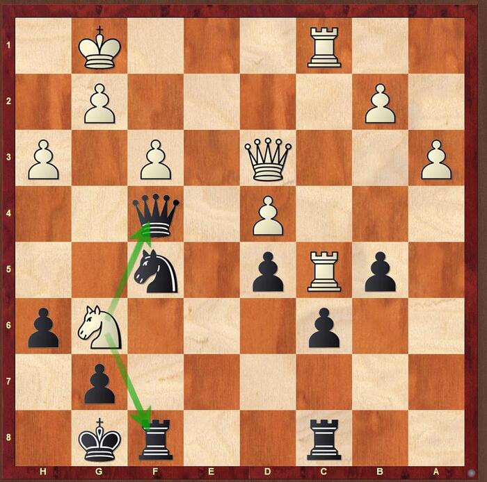 Если последует 16... Кf5, то как видно из бланка далее Фh5 после комбинации с двойным ударом белые еще больше упрочат своё преимущество - 2 слона против 2 коней и сдвоенные пешки у черных по линии с и h - явно не в пользу черных. Поэтому соперник выбрал другой путь защиты своей фигуры - конратаку на фигуру белых.