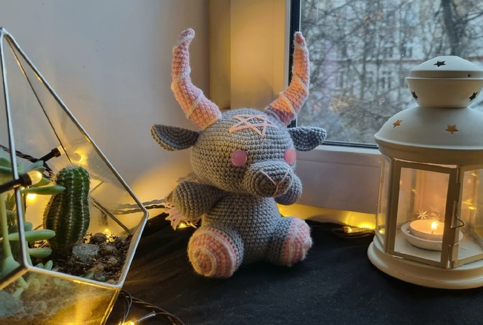Бафомет, олицетворяющих жадность уже нашел своего хозяина, однако не переживайте, я уже связала нового желтого Бафомета, и весь квартет Вы сможете увидеть на ярмарке "4 Сезона" в эти выходные.