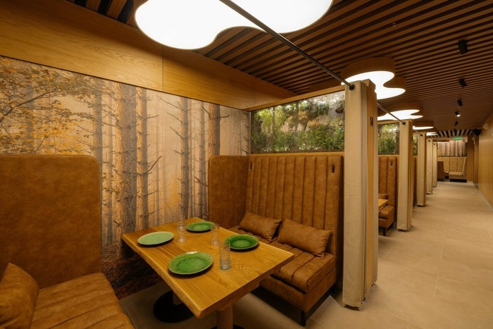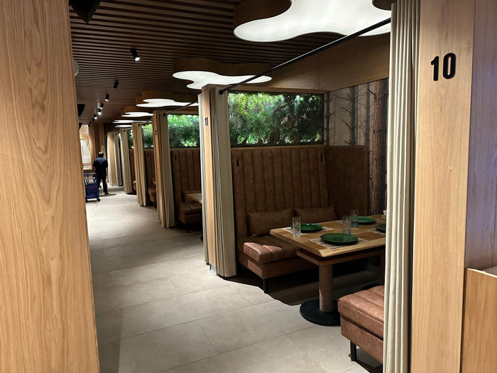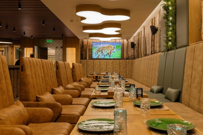 Удобные диваны, столы, крючки. Даже при полной посадке 6 человек на двух диванах удобно поместились и не мешали друг другу. Единственный момент, которого не хватает - кнопки вызова официанта на столе. Странно, что её нет, хотя Баня стремится к современным удобствам. Чтобы сделать заказ - нужно поднять руку