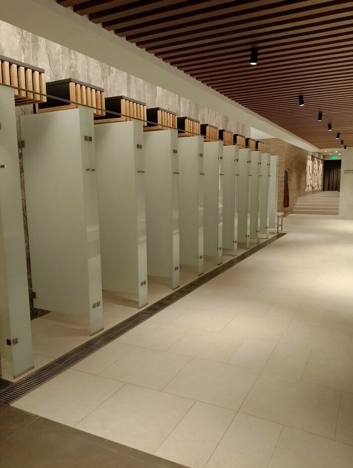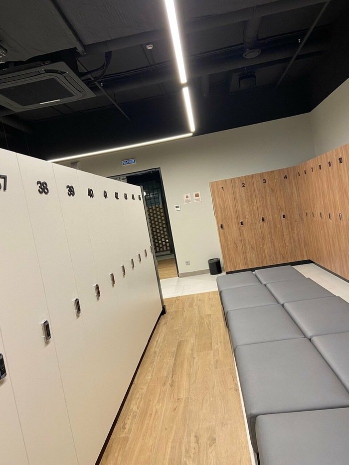 Раздевалка очень удобно сделана - лавки, ложки для обуви, широкие проходы. Шкафчик вмещает спортивную сумку, одежду на вешалках, обувь. Фен - 4-5 штук, 2 зеркала - отличная комплектация!
