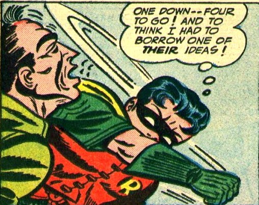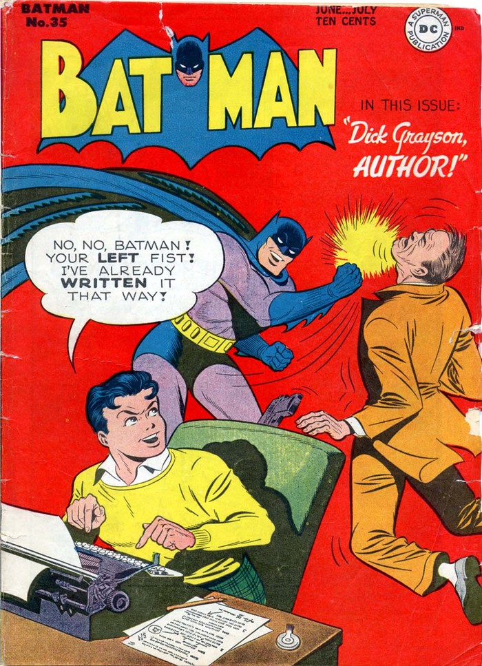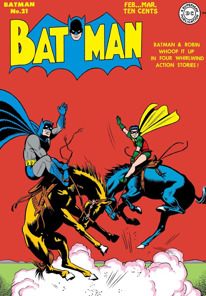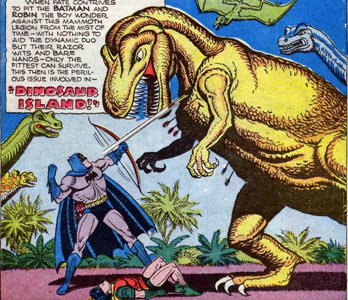 Десятый выпуск комикса, Batman #10, начинается с того, что Брюс Уэйн шлёпает Дика Грейсона по попе – так он поздравляет Робина с днём рождения. Мило. А превращается это в угашенное приключение – в честь дня рождения Робину дают порулить бэт-самолётом, он приземляется на странный остров, где всё ещё живы динозавры да пещерные люди, Бэтмэна чуть не съедают, а потом оказывается, что это Динамический Дуэт занесло на съёмки фильма про динозавров, а режиссёр просто решил включить супергероев в сюжет, потому что фильм про динозавров и Бэтмэна будет куда интереснее. Вторая история повествует о школолёнке-прогульщике, который попал в плен к бандитам и познакомился с прибывшими его спасать Бэтмэном и Робином (и пообещал больше не прогуливать), ничего интересного. В третьей истории Бэтмэн опять упустил (разумеется, совсем не специально, чтовычтовы) Женщину-Кошку (всё ещё в долбанутой кошачьей маске, но уже хотя бы в более стильном сине-фиолетовом платье), а в четвёртой истории он временно стал шерифом на Диком Западе, потому что гулять – так гулять.
