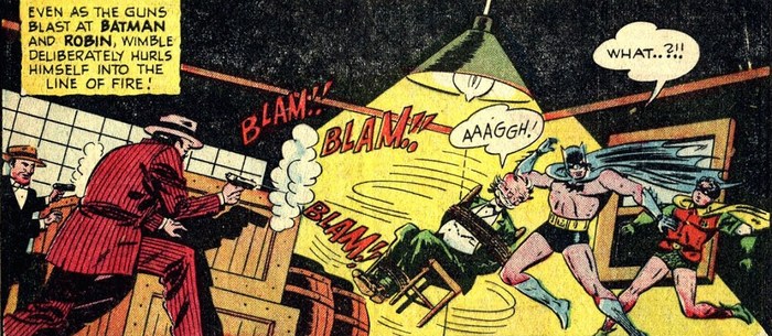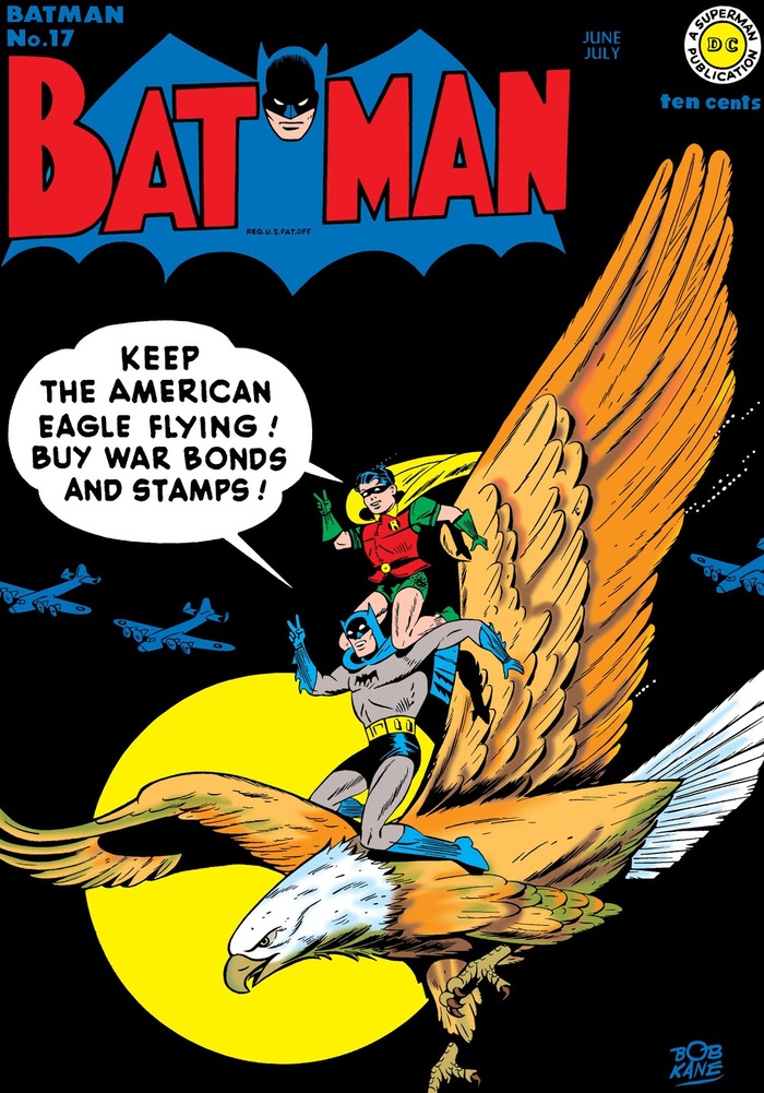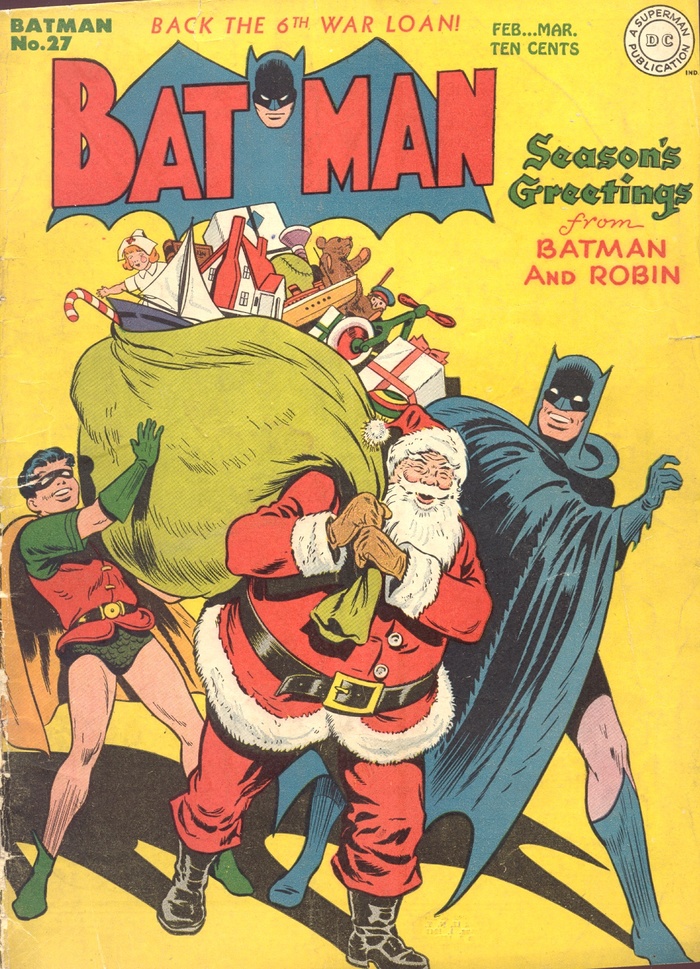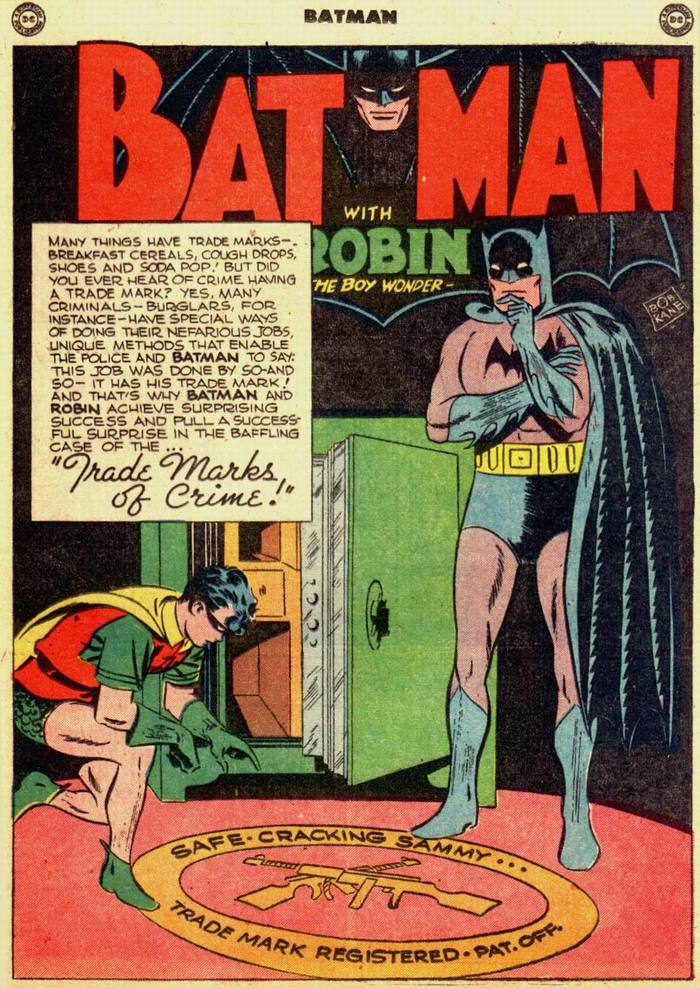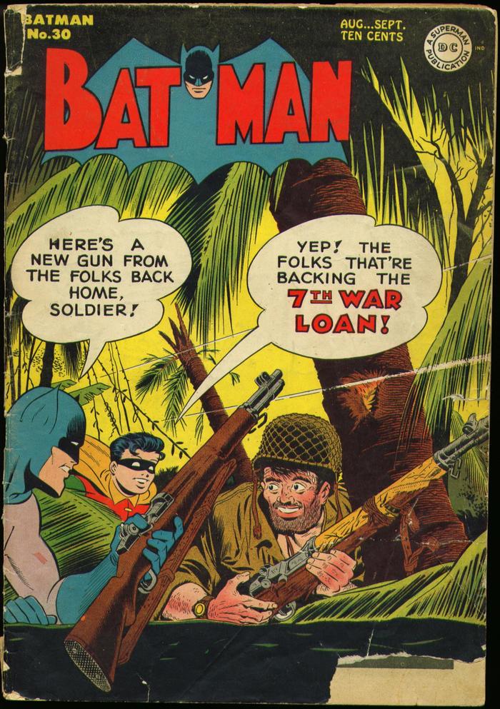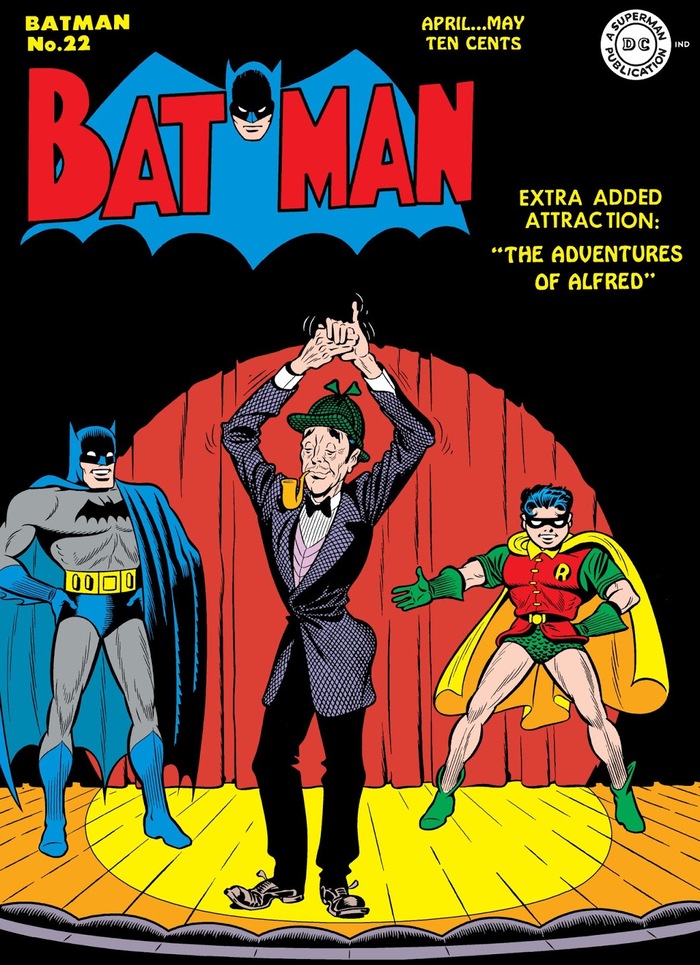 А остановлюсь я сегодня на выпуске Batman #12 за август 1942 года. Обложка призывает всячески спонсировать американскую армию, но в самом комиксе про войну ничего нет. Первая история - по сути, флэшбек. Бэтмэн и Робин вспоминают былые деньки, давно раскрытые дела. В том числе и дело братьев-преступников, один из которых пожертвовал жизнью, чтобы спасти невинного человека. Во второй истории Джокер решает потерроризировать народ, страдая буквализмом (Алло, Зиночка, ты щас умрёшь!). Затем Динамический Дуэт сражается с преступниками, специализирующимися на убийствах акробатов (нет, не теми, которые убили родителей Дика Грейсона, другими вообще, никто не любит циркачей). И наконец, в последней истории номера накал страстей несколько утихает. Бэтмэн пишет книгу о своей карьере, а в Готэме устраивают праздник в его честь – и под шумок совершаются преступления, которые Бэтмэн и Робин, как обычно, останавливают.
