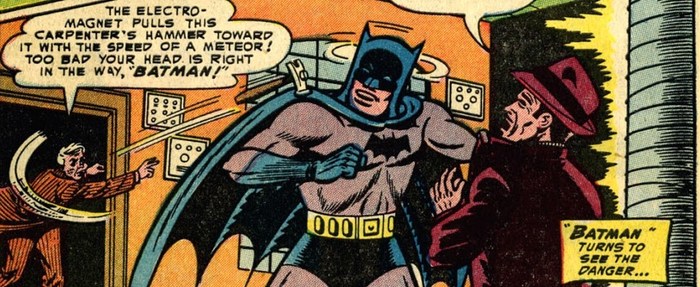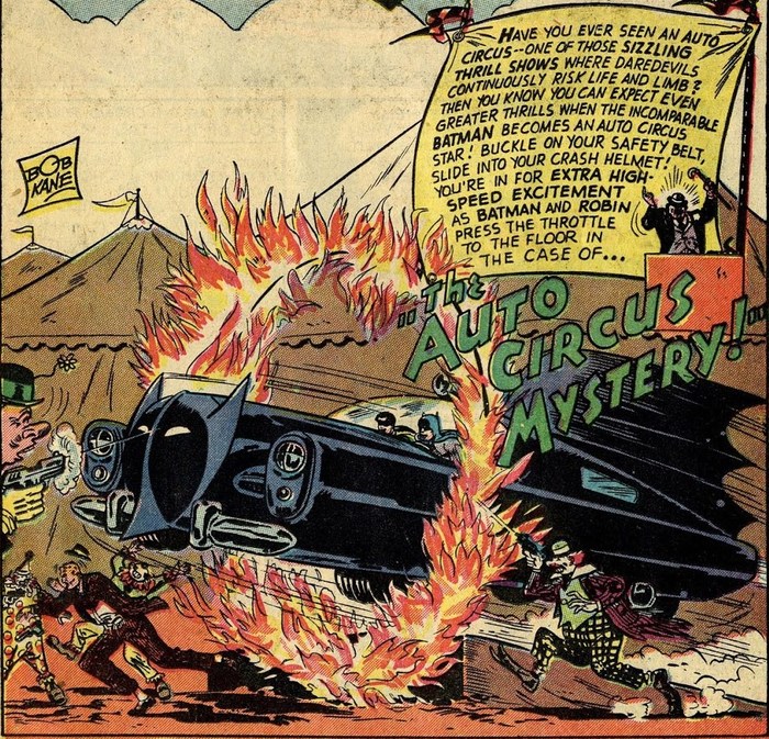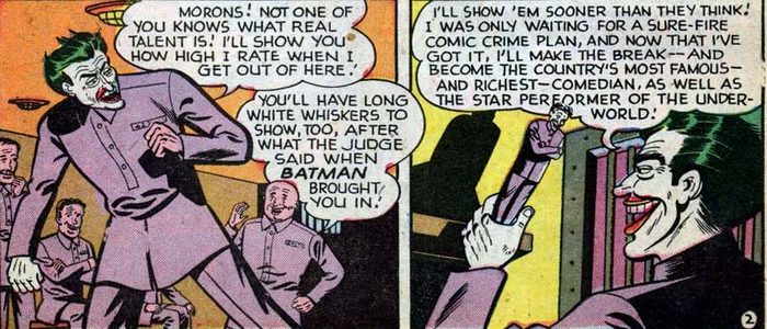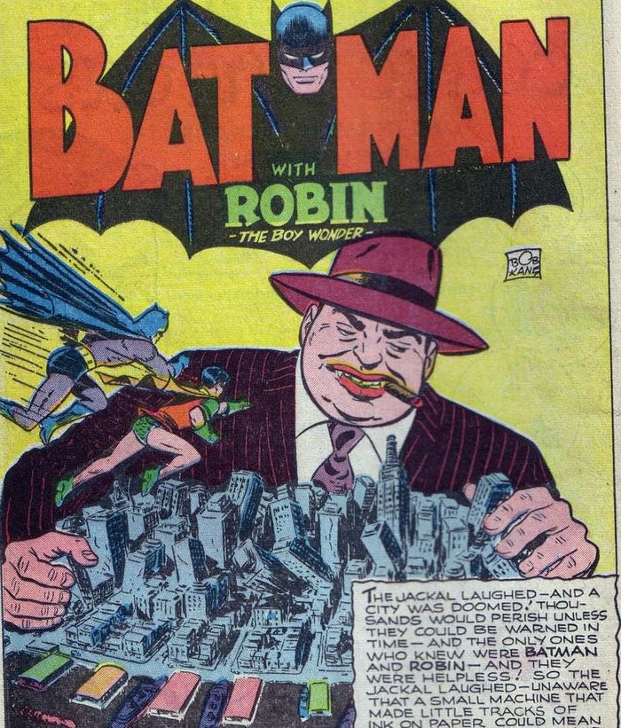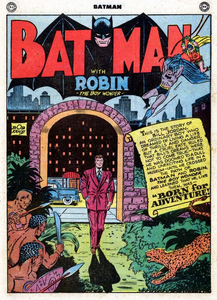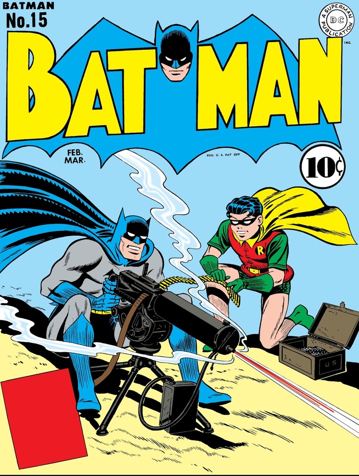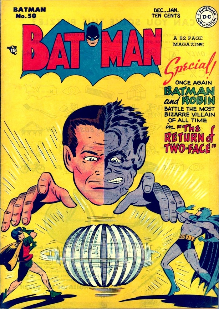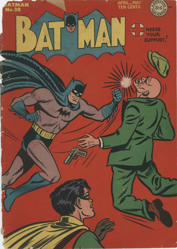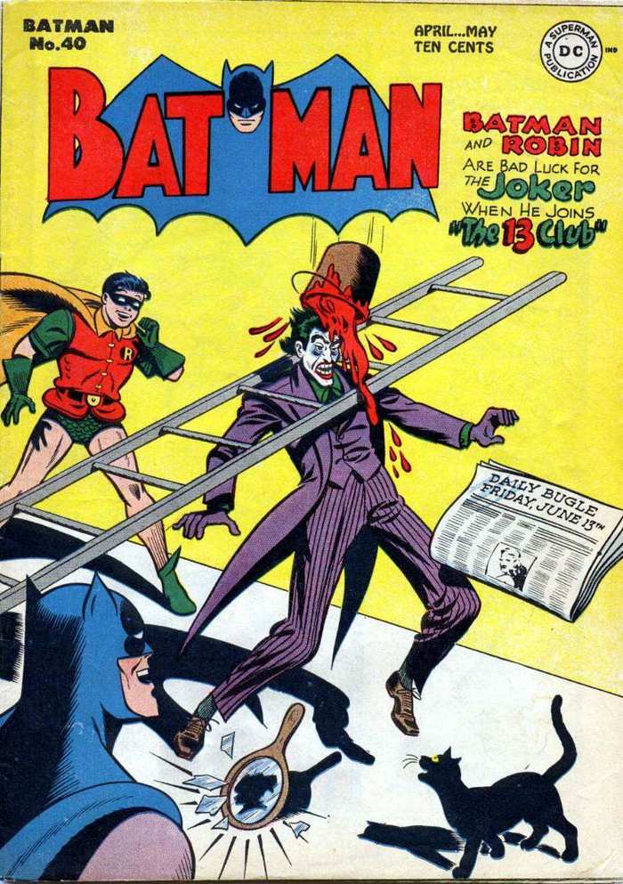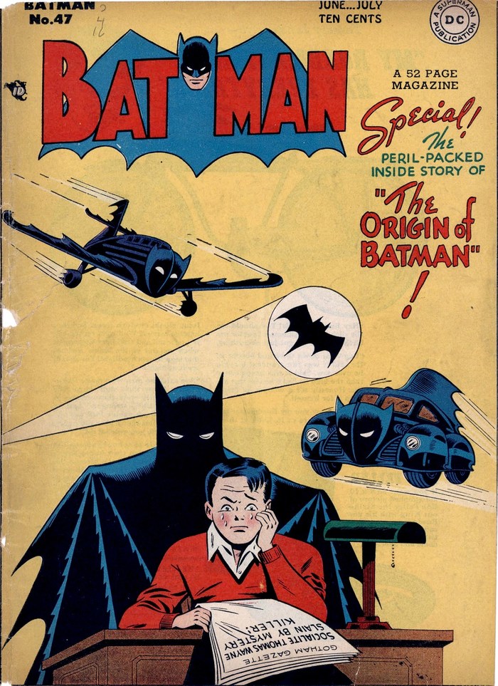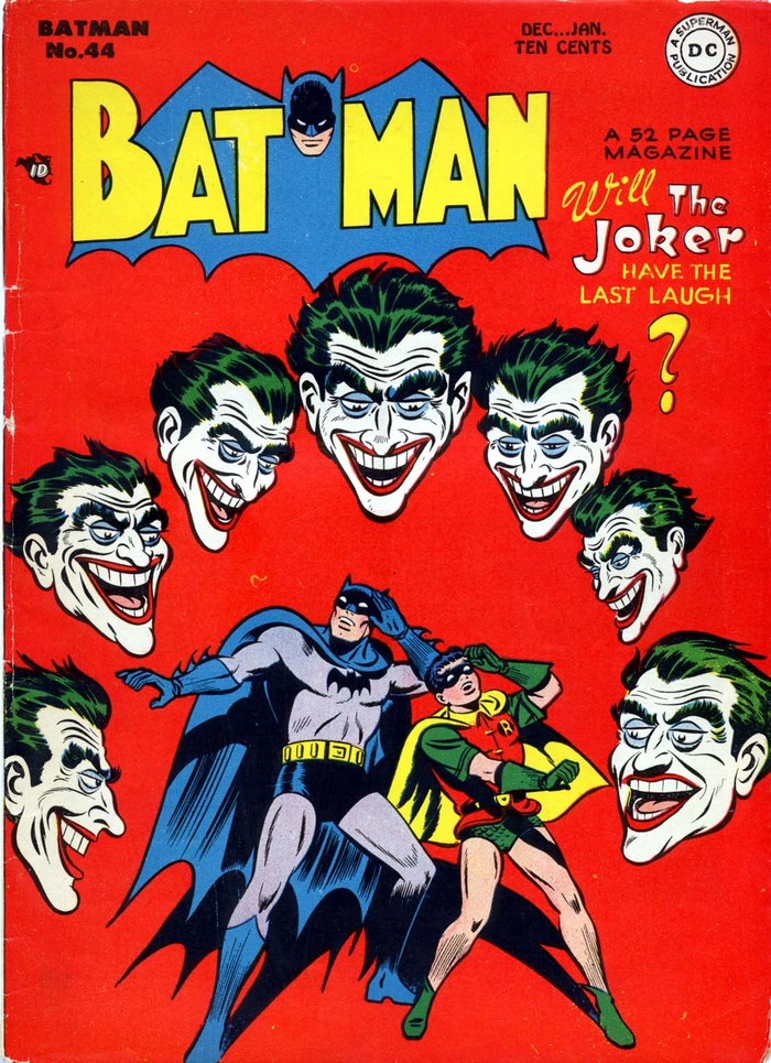Первые комиксы были упитанными. Batman #1 за 1940 год вмещает сразу несколько историй. В нём изложена краткая история того, как Брюс Уэйн стал Бэтмэном, в нём же читатели впервые знакомятся с Джокером. Победа над Джокером даётся Тёмному Рыцарю нелегко – и без Робина Бэтмэн в первом бы выпуске и погиб. Во второй истории номера Бэтмэн столкнётся с Людьми-Монстрами, созданными Хьюго Стрэнджем (им же посвящена короткометражка в честь юбилея Бэтмэна). По счастью (или не особо), в то время Бэтмэн ещё мог убивать, поэтому с этими «халками» он расправился радикально (пусть и сам чуть не стал одним из них). В третьей истории Бэтмэн впервые встретил Кошку, пытавшуюся прикинуться старушкой на пароходе. И отпустил (разумеется, совершенно случайно, а не потому что влюбился, чтовы-чтовы). А в последней истории Джокер вернулся и надрал Бэтмэну и Робину зад, после чего сам себя перехитрил и «погиб». Правда, врачи всё-таки его откачали, на свою беду. Так что продолжение следует…