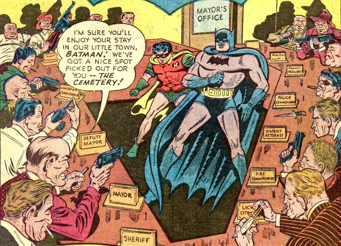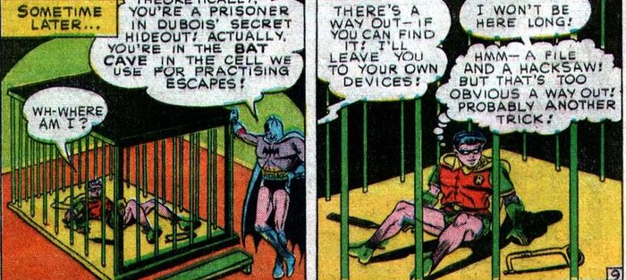 Вы таки не поверите, но преступники склонны совершать преступления, порой – даже сидя в тюрьме. Выпуск Batman #6 начинается с того, что прочно сидящий за решёткой преступник договаривается об условно-досрочном освобождении подельников, чтобы те совершали преступления за него. Но Бэтмэн их останавливает и возвращает в тюрьму. Кроме одного, которого «случайно» роняет в шахту лифта. Ранний Бэтмэн такой затейник! Во второй истории на Бэтмэна нападает Часовщик – поехавший старик с косой и практически неиссякаемым запасом динамита. Усилиями Робина старик отправляется в полёт с высокой колокольни аккурат на тот свет. В третьей истории Бэтмэн и Робин расследуют тёмные (и липкие) дела, творящиеся на нефтяной вышке (и Робин опять «случайно» убивает человека, ну так, чтоб не скучно жить). Интересы рабочих на сей раз торжествуют над интересами злодея-владельца вышки. А в четвёртой истории Бэтмэн помогает молодому полицейскому очистить репутацию, подпорченную работой в особо неблагополучном квартале. И ни одного именитого суперзлодея!