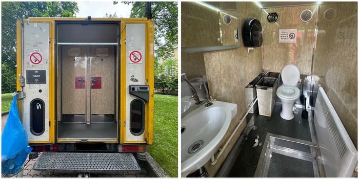 А куда без него? Он всегда желтый и еще называют желтком. Внутри — вполне комфортный и теплый со всем необходимым и водой. Во время съемочного дня группа ходит в него, а не в те туалеты, которые могут быть (или не быть) на локации.