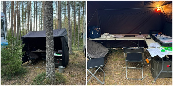 Да-да, у нас есть офис. И выглядит он вот так. Почти всегда это просто палатка. Внутри — столы, электричество, принтер (надо много всего печатать всегда) и канцелярия.