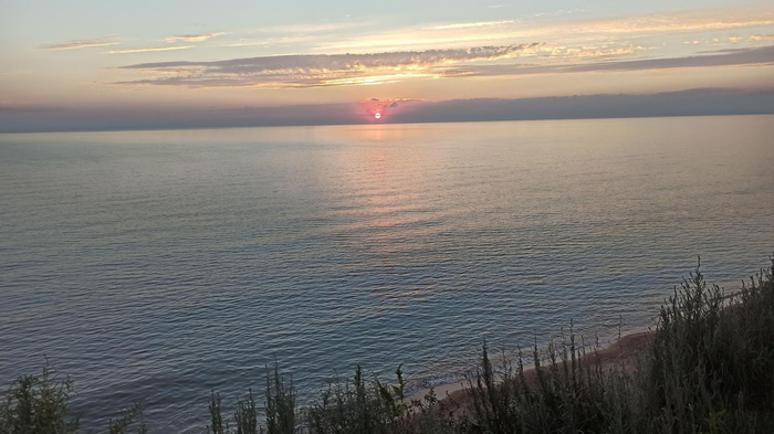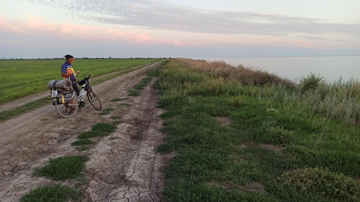 На ночёвку встаëм на берегу Ясенского залива Азовского моря. До посёлка Ясенская Переправа дорога идёт вдоль длинного пляжа и отделена от него полосой посадки. На пляже почти никого, лишь вдалеке виднеется одинокая машина, поэтому сегодня весь морской закат только наш.