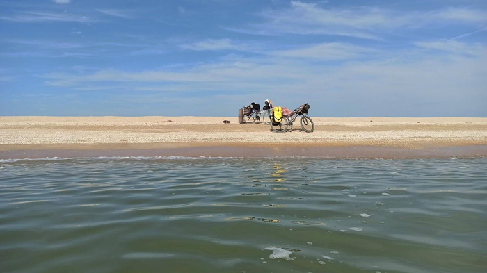 Как и обещали прогнозы, ветер стих, и море наконец-то успокоилось, хотя цвет воды всё ещё сероватый. Решаем напоследок искупаться в Азовском море, с этого дня мы начнём от него удаляться. Однако, решимость наша быстро улетучивается. После трёх суток непрерывного взбаламучивания, вода стала холодной, но это ещё пол беды, опять илистое дно и мелкота, как в Таганрогском заливе. Вроде бы Ясенский залив лишь немного изгибает береговую линию, сильно не углубляясь в сушу, но, видимо, на Азовском с этим всё строго. Раз ты залив - получи муть и мелководье. Получается, в приличном виде мы застали это море лишь один раз и то ненадолго на Долгой косе. Не густо, но зато теперь имеем полное представление о ситуации на этом побережье, как говорится, сам не увидишь, не узнаешь.