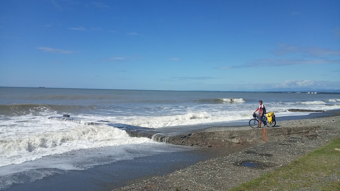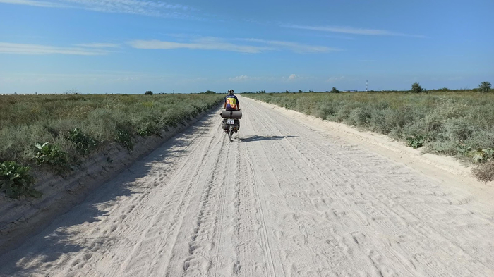 Выезжаем в полдень и двигаемся в сторону посёлка Ясенская Переправа. Часть пути катим прямо по линии прибоя, песок с ракушечником достаточно плотный, легко едут даже узкие колёса Ирины. Проехав посёлок, и начав от него удаляться по грунтовой дороге, обнаруживаю жестокую подставу от, затаившейся на время подломленной опоры багажника. Её просто нет! Треснул болт, и нижняя часть стойки, вместе с остатками крепежа, валяется теперь где-то на дороге. И что же делать? Как "заколхозить" поломку без потерянной части, пока не приходит в голову, даже в фантазиях с самыми смелыми допущениями. Надо искать, проехали ещё не так много, не могла же она отвалиться прямо на берегу.