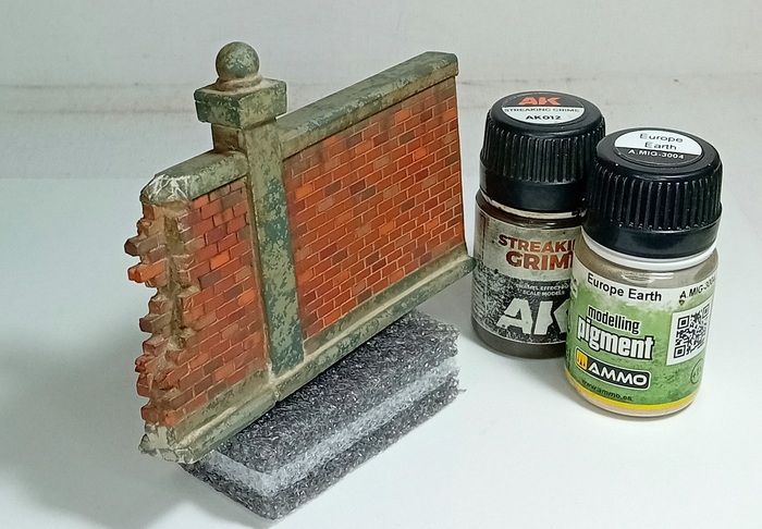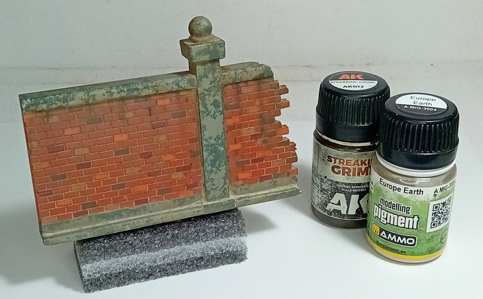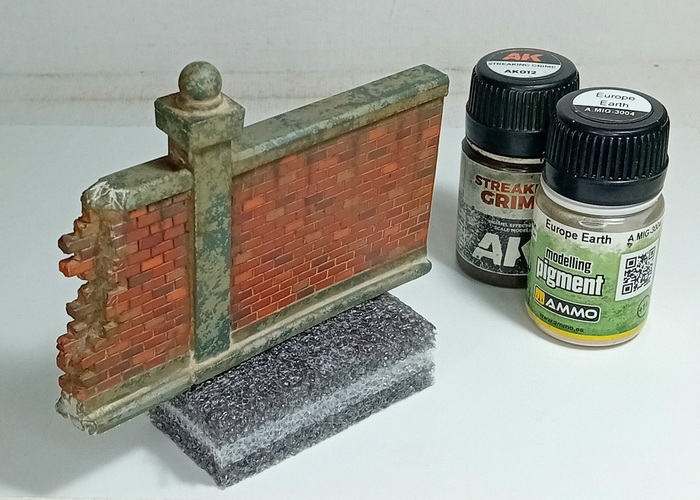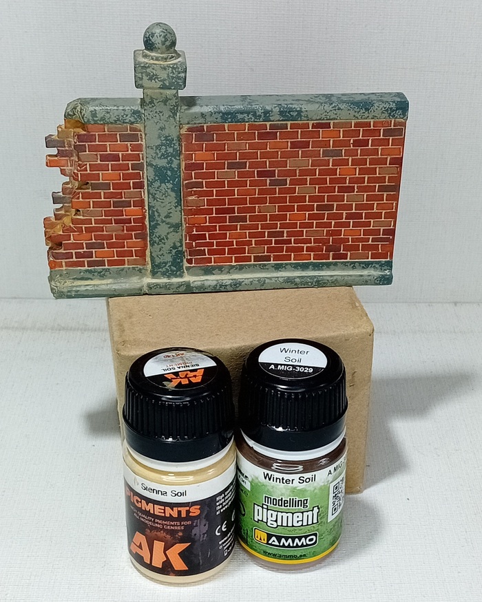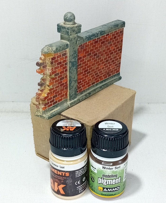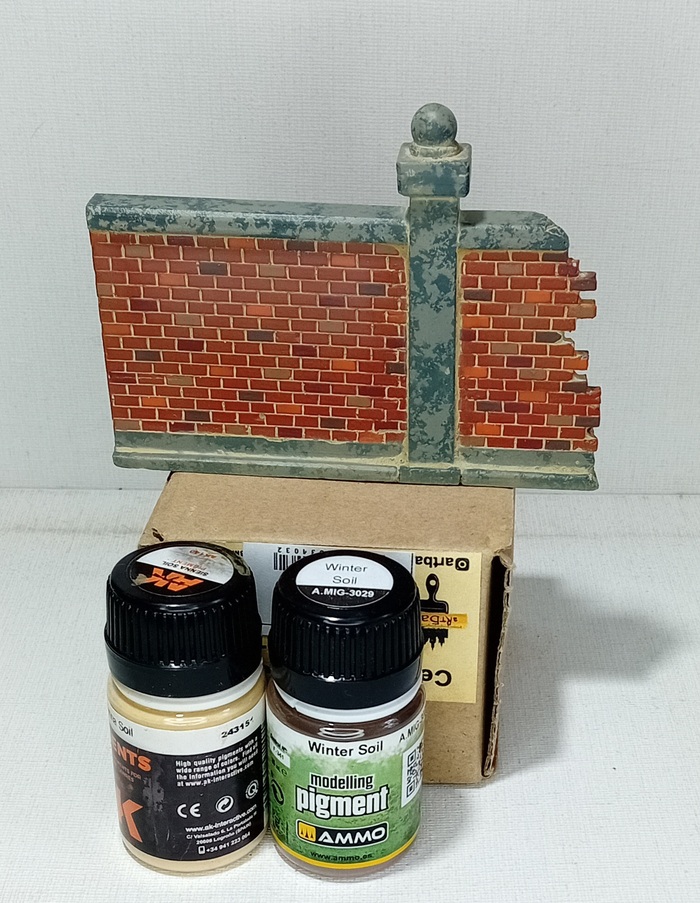 Кирпичную кладку я задул в коричневый цвет mr.hobby brown, а часть отдельных кирпичиков рандомно выделил 4 цветами, светлее и темнее базового. Вырисовывая отдельные кирпичи я работал тонкой кистью. Результат зафиксировал матовым лаком. Следующим этапом мне нужно было подчеркнуть смесь, которой соединяют кирпичи между собой в кладке и особенно в зоне разрушения. Для этого я взял 2 цвета пигментов светлосерого оттенка (европейская земля и сиена соил+винтер соил). Насыпав пигменты в две отдельные маленькие ёмкости, я смешал их с вайт-спиритом до состояния кашицы и нанёс широкой кистью на кирпичи. Дождался высыхания и излишки пигмента легко удалил спонжем.