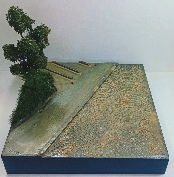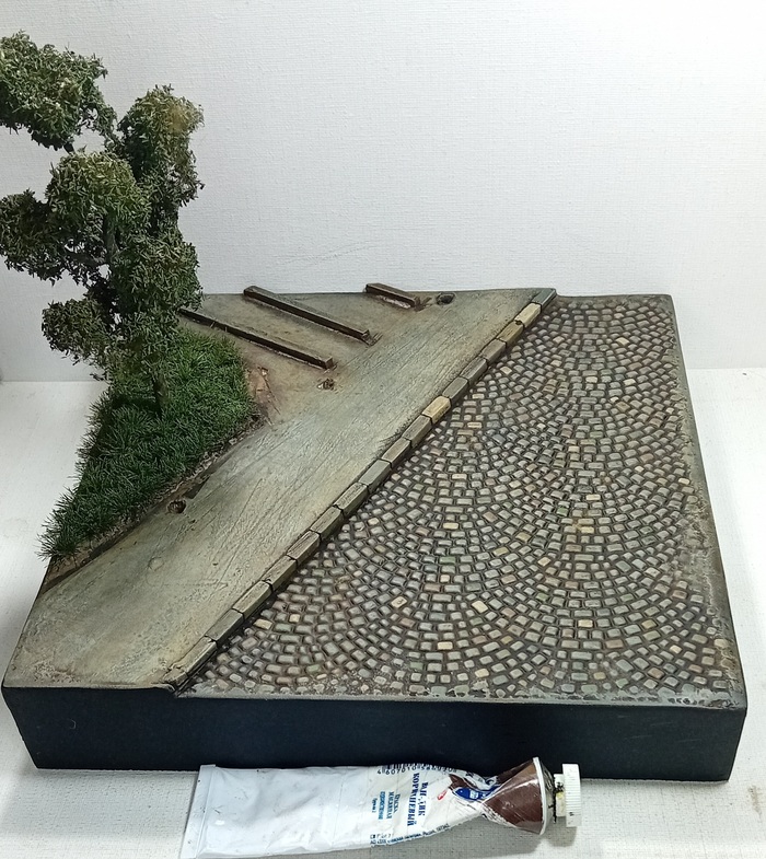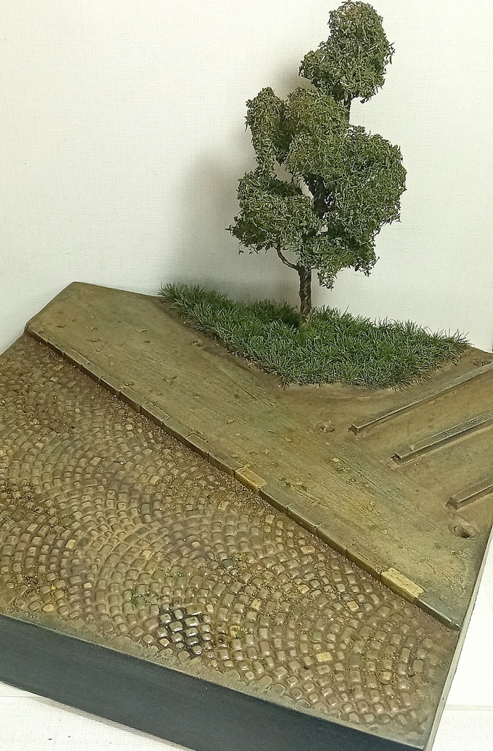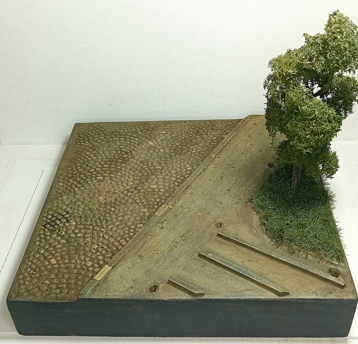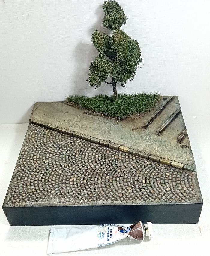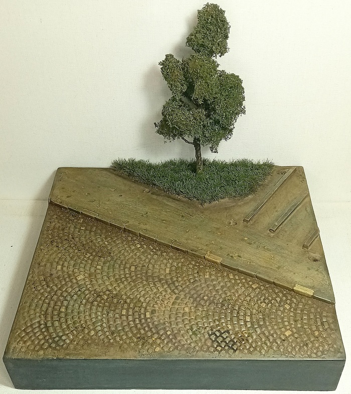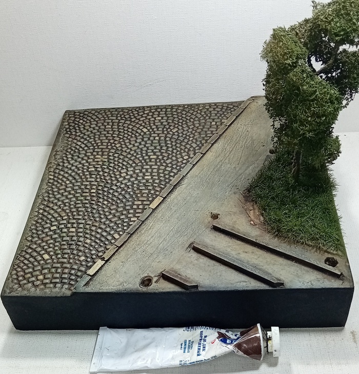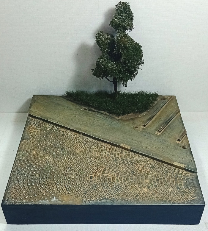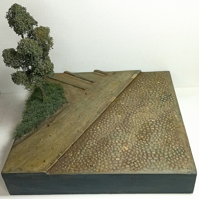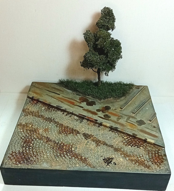 Вот такая подставка у меня в итоге получилась. Проделанной работой я более чем удовлетворён, в следующей части я расскажу о крупном элементе диорамы - немецком доме, который я уже почти закончил красить и тонировать. Всем спасибо за внимание и удачи! P.S. Отдельное спасибо тем 7 смелым людям, которые решили подписаться на посты, я Вам очень благодарен, это меня мотивирует делать посты подробнее и интересней.