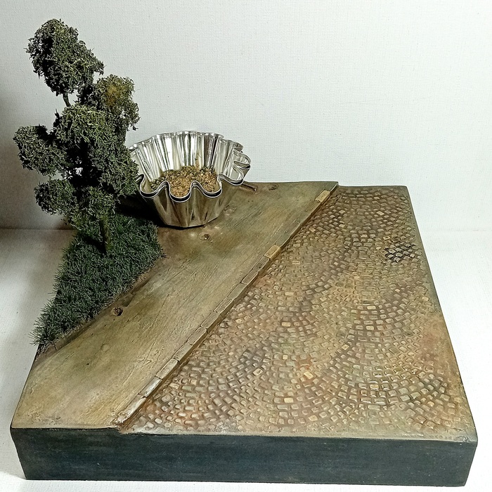 Через 12 часов текстурная паста и клей высохли и я продолжил работу по формированию структуры почвы. Наношу широкой кистью на рабочую зону смесь пигментов земляного оттенка. Закрепляю их разбавителем и жду полного высыхания. На этом работа со структурой почвы завершена.