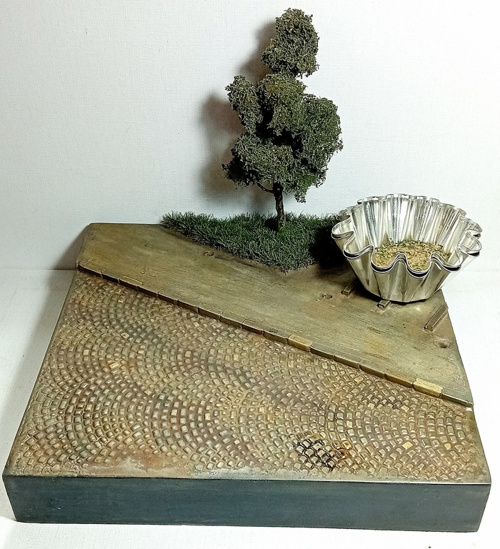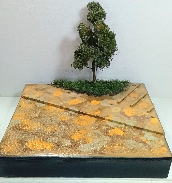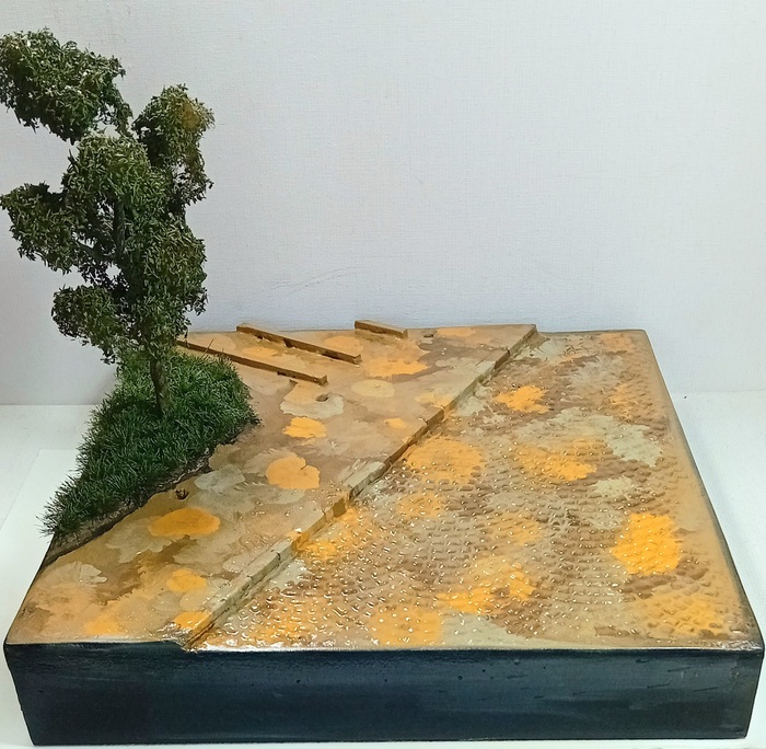 Вот что из этого получилось. Дальше я высаживаю изготовленое мной дерево и траву, а если бы хотел оставить просто землю, то стал бы добавлять сухие и влажные пигменты уже по месту, создавая пыль и грязь.