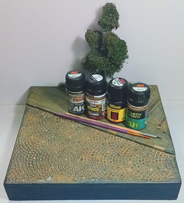 В зоне каменного основания нанёс кистью сильно разбавленный эффект земли от AK, миксанув его с сухими пигментами. Результат оказался вполне приемлем.