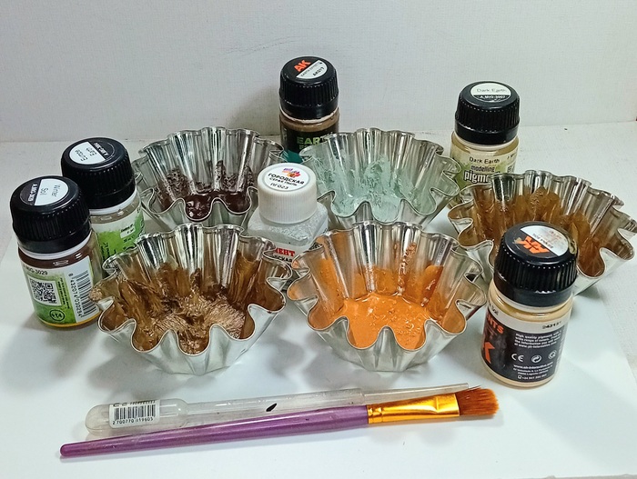 Для первого этапа мне понадобится текстурная паста и акрил на водной основе. Предварительно я оклеил рабочую зону маскировочной лентой. Смешав несколько цветов краски в палетке, я получил устраивающий меня светлый земляной оттенок. Обращаю внимание, что оттенок специально подобрал посветлее, чтобы дальнейшая покраска и тонировка на нем была заметна, а не превратила землю в сплошное тёмное пятно.