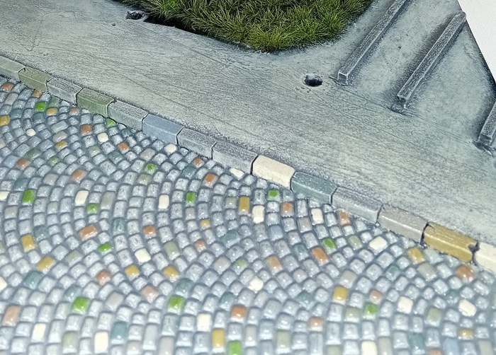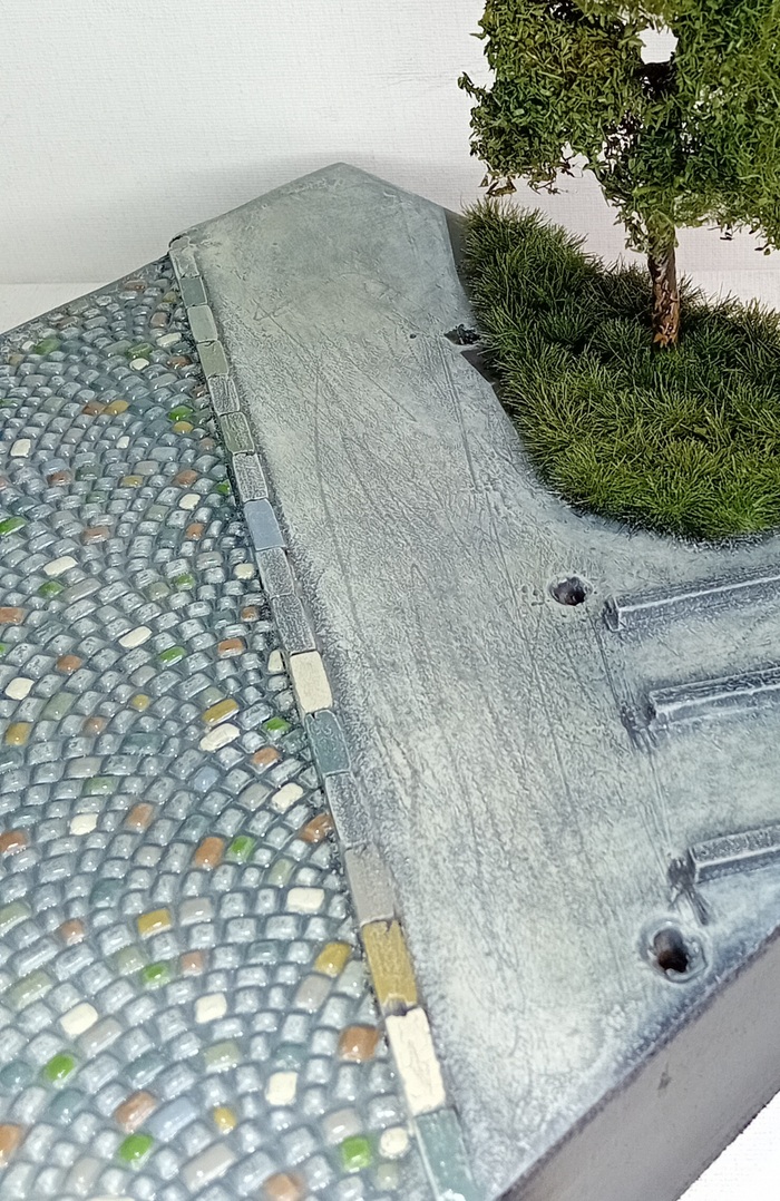 Для формирования булыжной мостовой я также взял в работу объемную текстуру от "Моррисон" и несколько листов А4 пластика толщиной 2 мм и 5 мм. Из толстого пластика я вырезал и приклеил к основанию на монтажный клей возвышение для тротуара и бордюрные камни, структуру булыжной мостовой я приклеил там, где по моей задумке проходит дорога, а тонким пластиком обшил получившуюся конструкцию. Обращаю внимание, что улица расположена под углом +/- 45 градусов к основанию и это важно, потому что такой принцип формирования диорамы как бы визуально расширяет её и придаёт композиции глубину. После финальной подгонки и шлифовки я загрунтовал получившуюся конструкцию серой модельной грунтовкой из баллона.