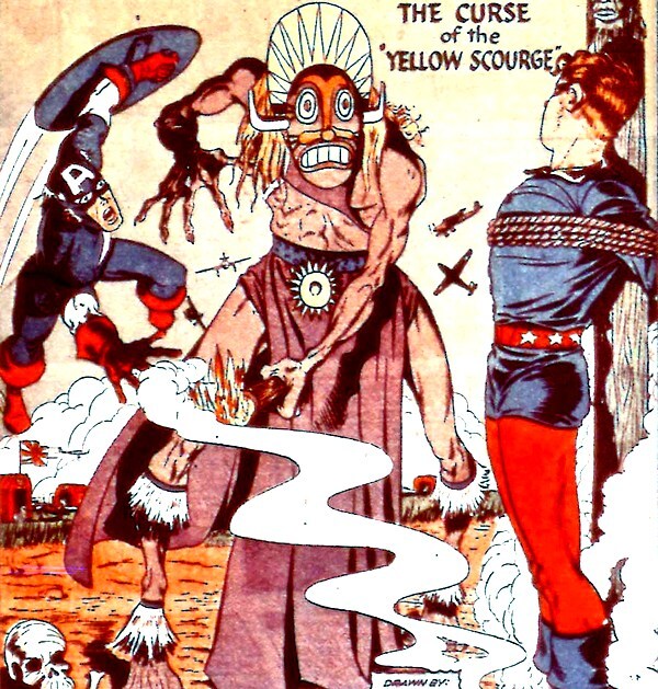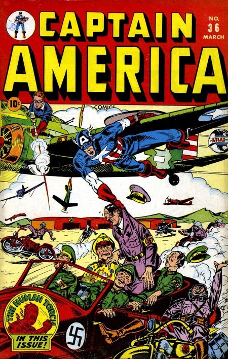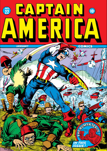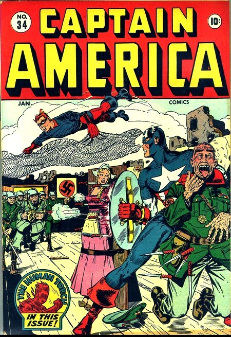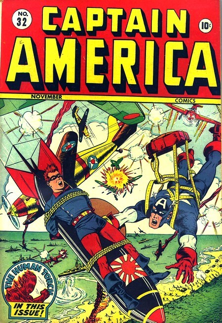Эх, доКодексные времена...ну, пора уже перейти к комиксу Captain America Comics #42. В истории «Мастера ужаса Тодзё» рядовой Стив Роджерс и «сын полка» Бакки Барнс, приставленные охранять генерала, узнают, что японцы готовят нападение на США. Генерал рассчитывает на помощь Капитана Америки и Бакки, так что звёздно-полосатые герои выдвигаются. Добравшись на подлодке до Токио, Кэп и Бакки попадают в плен, и генерал Ёкима отправляет их на расстрел. Казалось бы, всё, самая реалистичная история в комиксах? Но нет! Раскидав «палачей», звёздно-полосатый дуэт узнаёт, что японцы намерены подобраться к США незамеченными с помощью тоннеля. Быстренько скинув в тоннель несколько ящиков с динамитом и зажжённую спичку, герои уничтожают тоннель, тем самым убив уже спустившихся туда японцев вместе с ёкарным Ёкимой. Вторая история – ничего особенного. Человек-Факел и Торо охотятся на шпионов, попадают в ловушку из «асбестовой верёвки», кое-как выбираются чисто на рукопашке и сдают шпионов властям.