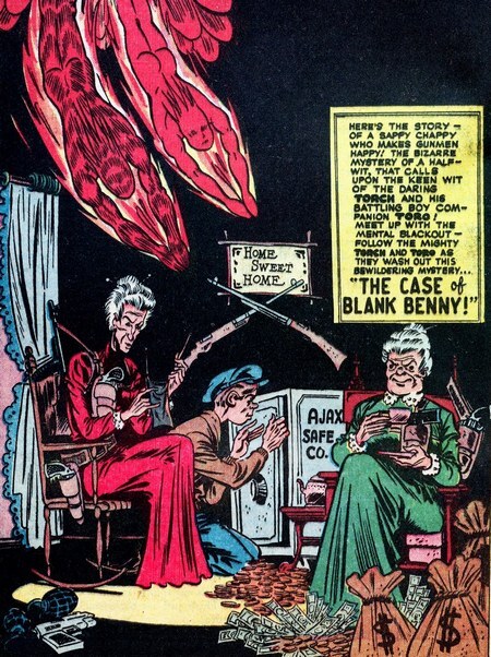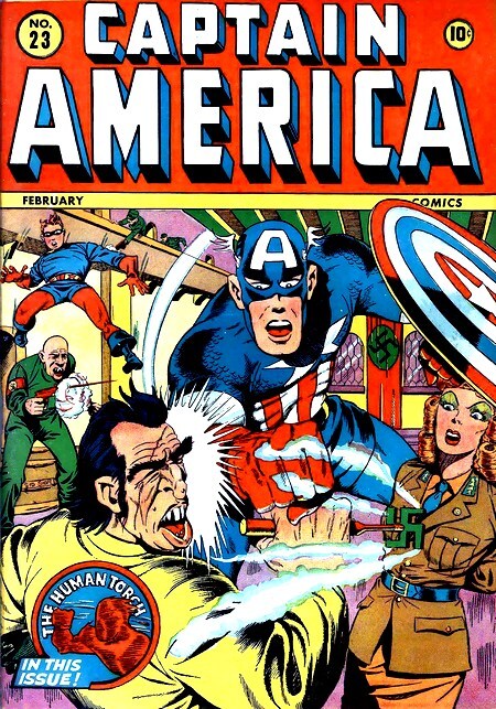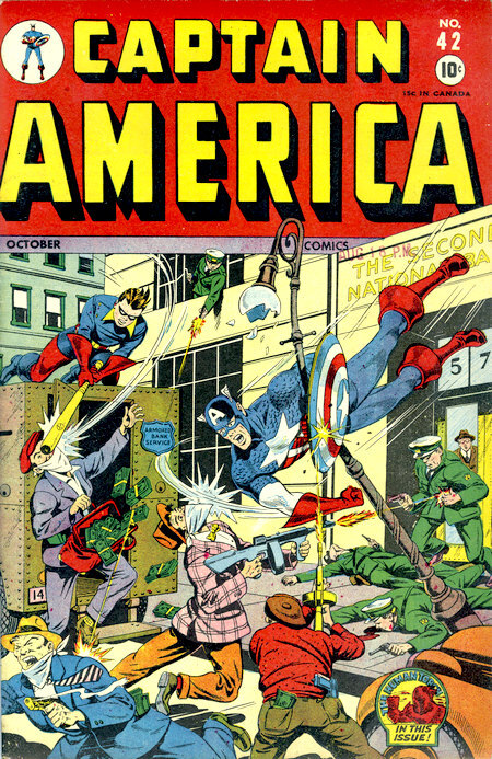 К этому времени запас нацистов в Германии и Японии уже начинает потихоньку иссякать, так что в следующей истории Человек-Факел и Торо ловят бандитов, которые решили ограбить банк. На сей раз отличился Торо, бросив файрбол в подготовленную бандитами взрывчатку и убив всех на месте. В современных комиксах из этого соорудили бы целую драму «Боги среди нас, герои берут на себя роль палачей», устроили бы Торо душевные страдания, типа он случайно, силу не расчитал, игры с огнём опасны...а тогда Факела и Торо похвалили. А в истории под названием «Полночь означает Убийство» Капитан Америка и Бакки охотятся на террориста, который зовёт себя Чёрной Рукой (никакого отношения к одноименному персонажу DC, который на тот момент в комиксах ещё не появился). Террорист пытается предотвратить массовое создание новых самолётов. В сражении с Капитаном Америкой террорист выпадает из окна, разбившись насмерть, и сняв с него маску, Стив видит под ней лицо владельца компании, которая эти самые самолёты и собирает. Вот ведь гад!