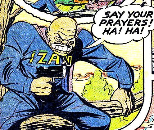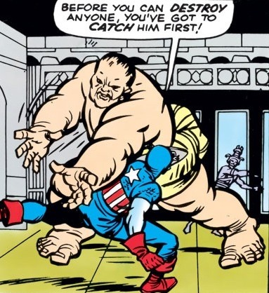 Раз так, прошу за мной в комикс Captain America Comics #54 за март 1946 года. Истории – опять-таки от Билла Фингера, ибо не всё же время ему одним Бэтмэном заниматься. В первой истории Капитан Америка и Бакки сражаются против банды Здоровяка – большого преступного авторитета, подчинённые которого грабят магазин мебели и похищают огромные столы и кресла. При персональном знакомстве оказывается, что Здоровяк просто компенсирует, потому что он сам лилипут. А вот амбиции у него что надо – Здоровяк решил похитить груз серебра. Звёздно-полосатым героям удалось предотвратить похищение, а вот остановить Здоровяка не удалось – он спрыгнул с крыши, используя шляпу в качестве парашюта, и сбежал верхом на собаке. Кэп уверен,ч то Здоровяк ещё вернётся...но с тех пор он в комиксах больше не появлялся.