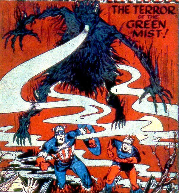 Сегодня приключения главного щитоносца вселенной Марвел начнутся в комиксе Captain America Comics #31 за октябрь 1943 года, первая история в котором называется «Ужас Зелёного Тумана». Гитлер, Геринг и Геббельс планируют задавить Америку своим новым супероружием! Вскоре на лагерь, где служат рядовой Стив Роджерс и «сын полка» Джеймс Бьюкейнан «Бакки» Барнс, десантируется гуманоид, состоящий. как кажется, из мха и травы. Караульные его расстреливают, и тот, подохнув, выпускает вроде безобидный газ...от которого начинает активно расти грибок. Плесень и грибница буквально пожирает лагерь, люди едва успевают эвакуироваться! Стив понимает, что тут не обойтись без Капитана Америки. Кэп и Бакки отправляются к месту следующего нападения (Гитлер лично оставил записку с предупреждением), сражаются с Фунгоидом (Гриболюдом), тот удирает, герои следуют за ним в Германию, попадают в плен в замке (не Вольфенштейн), освобождаются, уничтожают лабораторию, производящую «фунгоидный газ», и Капитан Америка лично убивает Гриболюда, после чего герои возвращаются в США.