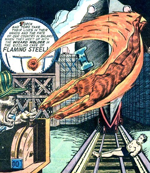 Огнеупорные материалы – злейшие враги пламенных героев, что доказывает следующая история. Раздобыв огнеупорный костюм, Виктория Мёрдок превращается в Асбестовую Леди – злодейку, которой не страшны способности Человека-Факела и Торо. Злодейка загоняет Факела и Торо в огнеупорную ловушку и собирается уничтожить, используя трофейное немецкое супероружие, дезинтегрирующее любые формы жизни – но это оружие огнеупорным не является. Факел его плавит, тем самым испугав злодейку, после чего уже голыми руками мягко её скручивает, лишний раз не прописывая по лицу, и сдаёт полиции. А ещё несколько лет назад злодейка на своём же оружии и подорвалась бы...