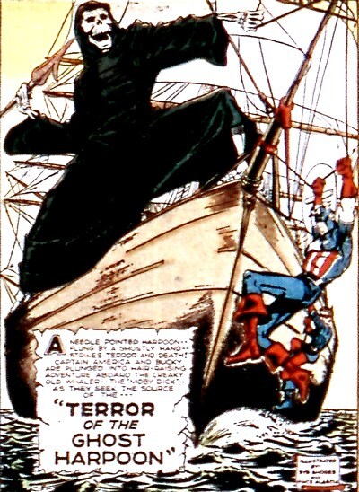 Ужаснулись? Хорошо! Идём дальше, в комикс Captain America Comics #39. В истории под названием «Ужас Призрачного Гарпуна» рядовой Роджерс и «сын полка» Барнс в увале отправляются порыбачить в Нантакет, что в Массачусетсе, а там местные поговаривают о Призрачном Гарпуне, который убивает рыбаков. Капитан Америка и Бакки берутся за расследование – и выясняют, что нет никаких призраков, а есть мошенники с гениальным стартапом. Вырядившись в костюм призрака, они убивают рыбаков, после чего те, кто ещё не погиб, продают мошенникам свои корабли задёшево. В стычке с Капитаном Америкой один мошенник тонет, второй падает с большой высоты и убивается. Во второй истории беспредельничают байкеры, японская банда «Всадников смерти», они похищают дочь владельца оружейного завода. Капитан Америка и Бакки находят логово банды и легко с байкерами разбираются. На сей раз обходится без убийств.