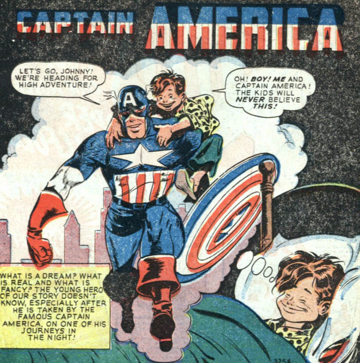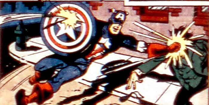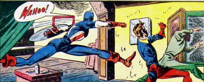 Так что пора гордо начать с комикса Captain America Comics #1 за март 1941 года, от Джо Саймона (история) и Джека Кирби (история и рисунок). . Ах да, небольшое предупреждение: комиксы в этот период были упитанными, историй в них было много, так что важные я буду расписывать более-менее подробно, а менее важные – в общих чертах либо пропускать. И вот она – первая история. Сетуют американские военные – шпионы везде, все приказы и распоряжения утекают в Германию. Но есть идея, как укрепить армию и противостоять шпионажу! Несколько генералов собираются у неприметного магазинчика, который оказывается тайным входом в ещё более тайную лабораторию, где на их глазах парню, которого соплёй перешибить можно, делают укол, и он превращается в богатыря – его сила, выносливость, координация и сообразительность доходят до пределов человеческих возможностей. Увы, и тут объявляется шпион, убивает учёного и уничтожает запас сыворотки суперсолдата прежде, чем случайно погибнуть от рук богатыря. Ну что поделать. Богатырь получает красно-бело-синюю звёздно-полосатую униформу и щит и стновится Капитаном Америкой. Но как его зовут? Об этом случайно узнаёт Бакки Барнс, армейский маскот (как сказали бы на постсоветском пространстве, «сын полка»), заглянув в палатку к рядовому Стиву Роджерсу, когда тот переодевается в звёздно-полосатый наряд, готовясь к новой миссии. «Узнал мою тайну – храни её! Теперь будем геройствовать вместе, как Капитан Америка и Бакки!».