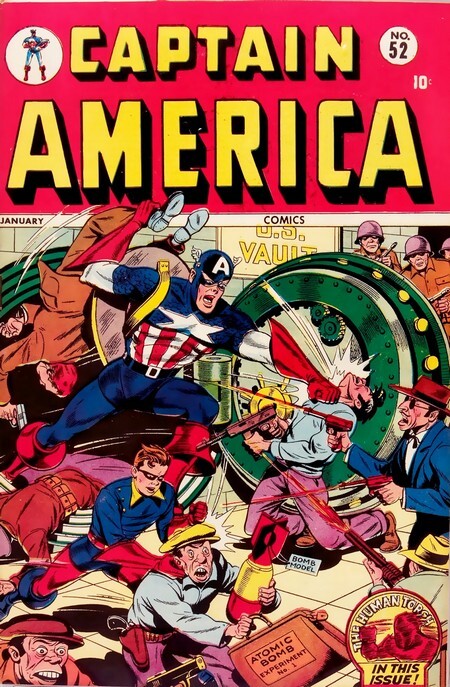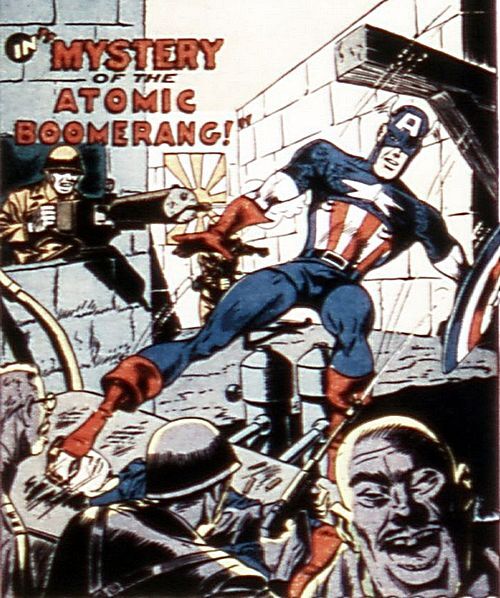 Прежде, чем приступим, уточню для тех, кто пропустил прошлую подборку: в самих комиксах главных персонажей упоминают как «Стив Роджерс» и «Бакки Барнс» – но лет эдак через 20 выяснится, что на данный момент ими уже являются Уильям Неслэнд и Фред Дэйвис. Я буду звать либо их настоящими именами, либо по прозвищам. Ну так вот, начинаем кавалькаду приключений с комикса Captain America Comics #51 за декабрь 1945 года и истории «Тайна Атомного Бумеранга» от Билла Фингера (автора кучи элементов окружения Бэтмэна). Японцы изобрели супероружие, Атомную Воду! Она взрывается, когда начинает испаряться! Японский профессор Сайко намерен с её помощью уничтожить американские военные базы, но Капитан Америка и Бакки ему в этом мешают (чуть не погибнув в процессе), и учёный подрывается на своей же «водице». Кэп сохраняет образец воды и приносит американским учёным, но те советуют его выкинуть, ведь они недавно разработали более совершенное оружие, атомную бомбу.