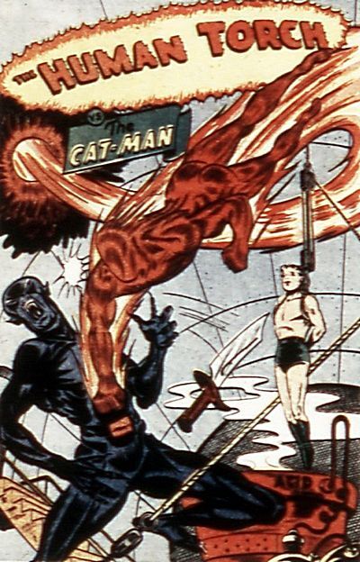«Убийства Человека-Кота» расследуют пламенные герои во второй истории. И нет, это не тот Кот, который появлялся несколькими выпусками ранее. Полиция просит Человека-Факела и Торо о помощи в поимке таинственного Кота, который убил пятерых человек. Человеком-Котом оказывается пациент местной дурки, выряженный в трико. Психиатр, доктор Кейл, использует его в качестве подопытного, ну и ради мошенничества и убийства неугодных, а в остальное время держит на цепи. Исход для психиатра печальный – сорвавшийся с цепи Кошак не узнаёт «хозяина» без маски и нападает на него, пламенные герои даже не успевают помешать. Кот и Кейл выпадают из окна, Кот погибает, а Кейл выживает, и его, еле живого, забирает полиция. Наконец, в последней истории Бакки хочет принять участие в юношеском боксёрском турнире, а в это время бандиты намерены смухлевать и забрать все призовые деньги. Для этого бандиты пытаются угрозами заставить юного боксёра Тимми специально проиграть в следующем матче. Но Капитан Америка, Бакки и отец Тимми (в прошлом боксёр, ныне уборщик) прописывают бандитам по голове. Правда, Бакки в процессе подворачивает ногу, так что в матче с Тимми не может выложиться на полную и проигрывает. Тимми же на выигранные деньги покупает спортзал, в котором его отец работал уборщиком, чтобы отец теперь залом владел. И жизнь продолжается!