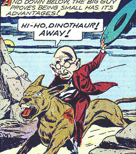 Геноцид всячески порицаю, не призываю и вообще фу, так что переходим к комиксу Captain America Comics #29, который начинается с истории «Король динозавров». Во время экспедиции в Антарктиде учёные находят замороженного динозавра! Один из учёных, доктор Шульц, оказывается сторонником идей нацизма, и к нему в голову сразу приходит замечательная идея. Он громко и гордо объявляет, что динозавра выставят в музее – а сам проводит сложную операцию, и пересаживает в черепушку динозавра мозг своего ученика/ассистента, Олафа. И начинает динозавр Олаф по приказу Шульца громить американские военные заводы, а военные не могут его остановить. Капитан Америка и Бакки, конечно, круты, но сражаться с динозавром – это уже перебор. Впрочем, увидев, как динозавр реагирует при виде сестры Олафа, Кэп понимает, что учудил Шульц. Когда Шульц берёт сестру Олафа в плен, Кэп привлекает внимание динозавра и сообщает, что Шульц сделал. Бакки спасает девушку, а рассерженный динозавр сбрасывает Шульца со скалы, а затем самовыпиливается, прыгнув вслед за ним. Вот он был – и вот его не стало.
