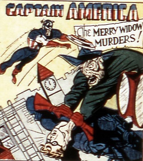 А названия у историй всё интереснее, вот, скажем, первая история в комиксе Captain America Comics #17 за август 1942 года, называется «Монстр из морга». Эх, докодексные времена...жил да был завистливый учёный, доктор Вейрдлер, и узнал он, что его коллега создал сыворотку, позволяющую оживить мёртвые тела, и вознамерился опробовать её на горилле. Обзавидовался Вейрдлер и предварительно пересадил в башку гориллы мозг погибшего преступника, Убийцы Коула. А эксперимент провалился, горилла не ожила и её закопали. А потом в могилу ударила молния, убийца в теле гориллы выбрался из могилы, освободил из зоопарка ещё двух горилл, сколотил из них банду и отправился убивать судей, которые отправили его на электрический стул. А расхлёбывать всё это пришлось Капитану Америке, который сразился с Убийцей Коулом на крыше небоскрёба, и с этой крыши убийцу в полёт и отправил. А доктор Вейрдлер раскаялся и прикрыл Кэпа собой от брошенного убийцей Кэпу в спину ножа. Доктор погиб.