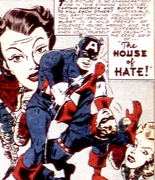 А это значит, что на очереди комикс Captain America Comics #49 и история с заводным названием «Лига Ненависти». На дворе июнь 1945 года (комиксы, как и многие журналы, датированы наперёд, так что комикс за август 1945 выходит в июне). Неизвестные злоумышленники сеют ненависть! Они ломают надгробия американских солдат и громят магазины и дома, принадлежащие американцам иностранного происхождения (неграм, полякам, евреям и т.д.), стремясь разделить общество – «Америка для американцев, чемодан-вокзал-валите отсюда». И вот, в городок, где это происходит, прибывают Уильям "Стив Роджерс" Нэсленд и Фред "Бакки Барнс" Дэйвис, и решают расследовать эту ситуацию, как Капитан Америка и Бакки. Они находят немецких шпионов, которые маскируются под раненых американских военных, после чего Кэп толкает речь по радио на тему того, что только враги стремятся разобщить американское общество, и человек человеку – друг. Во второй истории Человек-Факел и Торо ловят убийцу ювелира. Но поймать преступника не удаётся – спасаясь от пламенных героев, преступник спотыкается на лестнице и ломает себе шею.