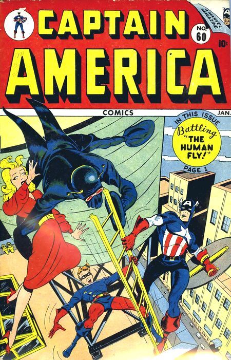 И вот как-то так дело и подходит к комиксу, который завершит сегодняшнюю часть подборки – Captain America Comics #60 за январь 1947 года, с историями от Стэна Ли и рисунками от разных художников (в том числе Кармайна Инфантино). В город прибывает цирк, гвоздь программы в котором – Человек-Муха, акробат в особом костюме, который позволяет ему липнуть к стенам. Вскоре в городе начинают происходит кражи из квартир на верхних этажах зданий, и свидетели утверждают о человеке в костюме Мухи. Подозревая циркача, звёздно-полосатые герои направляются в цирк – но цирковой Мух утверждает, что кто-то умыкнул его запасной костюм. Вскоре выясняется, кто именно – глава компании, занимающейся мойкой окон. он подсматрвиает, кто где прячет драгоценности, после чего крадёт их. Прихлопнуть (не насмерть) Муху удаётся, облив патокой. Липкого и растерявшего полимеры вора Кэп сдаёт полиции.
