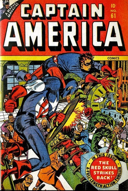 Сегодняшняя звёздно-полосатая эпопея начнётся с комикса Captain America Comics #61 за март 1947 года и истории под названием “Красный Череп наносит ответный удар”, отрисованной Элом Эйвисоном. Красный Череп таки действительно возвращается, захватывает тюрьму и собирается ещё и перехватить поставки пенициллина, чтобы американским солдатам было нечем лечиться! За дело берутся Капитан Америка (Джеффри Мейс под именем Стива Роджерса) и Бакки (Фред Дэйвис под именем Бакки Барнса), и после нескольких раундов сражений загоняют супостата на дамбу, с вершины которой краснорожий после удара по лицу и падает насмерть. Ну, как “насмерть”... он ещё вернётся. Вообще в истории об этом не говорится (а раскроется позже, в другом комиксе), но этот Череп – самозванец, и он таки погибнулся, а вернётся настоящий. Но не сейчас.
