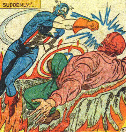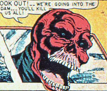 Бодрячком пошло? Тогда продолжаем в комиксе Captain America Comics #3, первая же история в котором обещает вернуть Красного Черепа. Странное дело, но инженер Джордж Максон, скрывавшийся под маской Красного Черепа, пережил смертоносную инъекцию, и уже похитил чертежи сверхсовременной (ну, для 1941 года) бурильной машины! Времени зря он не теряет, а активно эту машину сооружает. На беду, неподалёку ошивались двое бандитов, вырядившихся в Капитана Америку и Бакки, чтобы помошенничать со сбором денег. Приняв их за настоящих героев, Череп их похищает и вешает. Ага, на виселице. Но о его планах узнают настоящие Кэп и Бакки, находят его логово и набрасывают ему зипдюлей. Череп пытается сбежать, бросив в героев бомбу и запрыгнув в бурильную машину, но Капитан Америка возвращает бомбу отправителю, машина взрывается, и Красный Череп погибает. Во второй истории Кэп останавливает убийцу, прикидывающегося горбуном и пытающегося сорвать съёмки фильма, порочащего нацистов.