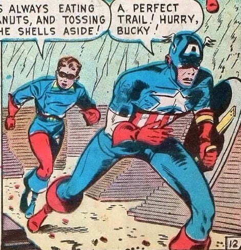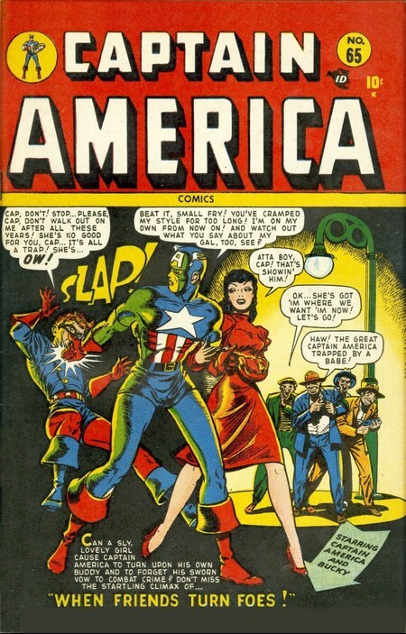 Практически семейная драма звёздно-полосатых героев разворачивается на обложке комикса Captain America Comics #65. Бакки сражается с бандитами в одиночку и получает по голове. Почему? А его бросил Кэп. Опять же, почему? А Кэпа охмурила красотка Грейс, с которой тот весело проводит время. Бакки пытается Капитана увещевать, но тому девчуля важнее боевого товарища. Кэп даже объявляет, что не желает Бакки больше видеть. Абидна! Уходит Бакки такой весь печальный и берётся самостоятельно за поимку банды, которую возглавляет роковая женщина. Оказывается, Кэп тоже охотится на эту самую банду! После серьёзной потасовки оказывается, что таинственная предводительница банды – та самая Грейс, и Кэп это отлично знал. Бакки он от себя оттолкнул, когда банда пообещала пацана убить (клише комиксов конца Золотого и начала Серебряного Века: говорить словами через рот - зашквар, лучше действовать так, чтобы тебя сочли за мудака, а значительно позже всё объяснить и тебя все простят). Раскидав банду и сдав Грейс полиции, Кэп мирится с Бакки, и все довольны. Кроме Грейс.
