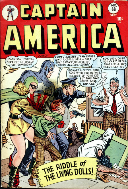 Мистикой и не пахнет в комиксе Captain America Comics #68. Бакки продолжает валяться в больнице, а Капитан Америка и Золотая Девушка сталкиваются с изготовителем марионеток, которые, похоже, живут своей жизнью, грабят банки и отстёгивают часть добычи своему создателю. Но ведь я только что сказал, что мистики тут нет? Ну да. Просто среди марионеток живут карлики, которые очень неплохо прикидываются ветошью (это которая история о Кэпе и злых карликах-марионетках? Третья или четвёртая?). Но Кэп выводит мини-банду на чистую воду, когда “Марионетки” пытаются украсть инкрустированный рубинами кукольный домик. Вторая же история – назидательная. Мальчик по имени Джонни просыпается и видит у себя в спальне Капитана Америку, который медленно снимает штаны. Кэп насильно выводит мальчика из дома и идёт с ним подсматривать за тем, как проводят ночь его учительница и продавец в ближайшем магазине (не вместе). Поняв, что они тоже люди, Джонни обещает больше никогда не хулиганить и не изводить их.