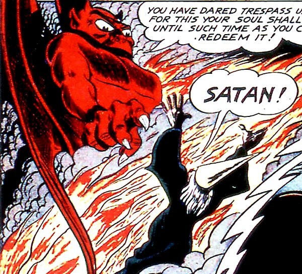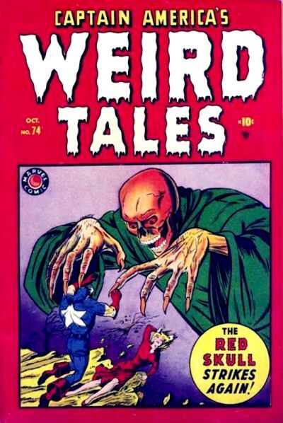 А со следующего выпуска, за октябрь 1949 года, комикс эксперименту ради меняет название на Captain America’s Weird Tales #74. С места в карьер: в Аду Красному Черепу удаётся умыкнуть у Сатаны Книгу Проклятых Душ, и он вписывает туда Капитана Америку. На Земле в дверь Джеффри Мейса стучит демон. “Здрасьте, вам повесточка в Ад, следуйте за мной”. А в Аду Сатана такой, “Погоди, ты же добряк, фигли ты сюда попал? А, стопэ, Череп в книге начёркал...ну, что написано пером, не вырубишь топором, располагайся”. Даже если книгу украли и использовали без разрешения, правила есть правила: кто вписан, тот обречён.