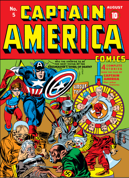 Нацистский цирк (нацирк?) творится на обложке комикса Captain America Comics #5. В город неподалёку от лагеря Лехай, где служит рядовой Роджерс, прибывает цирк! Разумеется, оказывается, что все его участники, от конферансье до последнего карлика, являются нацистами, и их настоящая миссия – убить высокопоставленных военных. Циркачи похищают Бетси Росс, а попытавшимся вступиться за неё Капитану Америке и Бакки навешивают люлей. Оклемавшись, Кэп и Бакки всё-таки спасают Бетси, Кэп лично отметеливает конферансье и сдаёт его властям, после чего рядовой Роджерс получает очередной нагоняй от сержанта Даффи за самоволки. Подозреваю, такого недисциплинированного бойца в реальной жизни не в наряд на кухню отправили бы, а на гауптическую вахту, а в военное время – не исключено, что на расстрел, и сержант Даффи, являясь комическим персонажем-истеричкой, на самом деле раз за разом спасает рядового Роджерса своими нарядами. Гхм. Во второй истории рядовой Роджерс и Бакки сопровождают генерала Хейвуда в Гонолулу, и так сталкиваются с подводной лодкой, замаскированной под дракона. Кэп и Бакки врываются на борт и задерживают японского высокопоставленного военного.