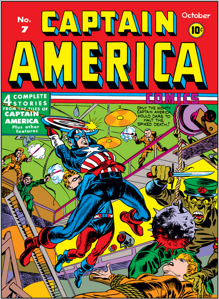 Теперь-то можно перейти к комиксу Captain America Comics #7 за октябрь 1941 года, от тех же Джо Саймона и Джека Кирби (и приютившегося в уголке новичка Стэна Ли). Первая история называется просто и лаконично – «Красный Череп». Да, этот поганец вернулся. Но как?! Он ведь уже дважды погиб! Ну...нет. Погиб один из его приспешников, а настоящий Красный Череп теперь намерен устранить всех прихвостней, которые его подвели. И начинают погибать американские военные и рабочие, представители нацистской пятой колонны. А Капитан Америка и Бакки носятся туда-сюда, как ужаленные, постоянно попадая в тупики и упуская злодея. В итоге Кэп сражается с Черепом на пристани, Череп падает в воду, Кэп считает, что враг наверняка утопнулся, и уходит, ведь есть дела поважнее – рядовой Роджерс должен сыграть в театральной постановке. Во второй истории Капитану Америке противостоит Чёрная Жаба – бейсбольный менеджер, поехавший кукухой на теме трудоголизма и ставший убийцей. Сдаваться Кэпу Жаба не собирается и заканчивает жизнь самоубийством, спрыгнув с большой высоты.