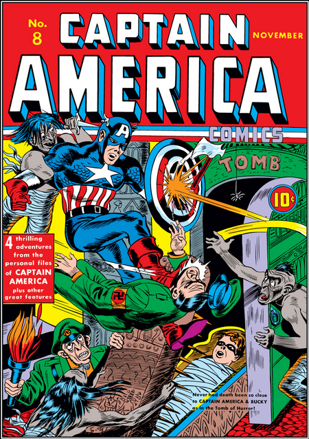 Нацисты объединились с расистскими стереотипами в комиксе Captain America Comics #8. Было же время, когда за это не «отменяли». В первой истории рядового Стива Роджерса, как обычно, прессует сержант Даффи, зато Кэп и Бакки разгадывают загадку проклятого рубина – любой, кто владеет рубином, погибает от рук загадочного Мстителя Ра. Под маской египетского злодея оказывается археолог, который изначально рубин и нашёл. Во второй истории в лагерь Лехай, где расквартирован Стив Роджерс, прибывает один из лидеров французского сопротивления, майор Дюмор. Вскоре начинаются манёвры – и Стив Роджерс и Баки Барнс с ужасом понимают, что кто-то подменил патроны с холостых на настоящие! Капитан Америка и Бакки решительно прерывают учения и идут искать западлиста – и им оказывается майор Дюмор, который на самом деле шестерит на нацистов и ему поручили устранить как можно больше американских солдат. Скрутив Дюмора и его подельников, Кэп и Бакки передают их властям.
