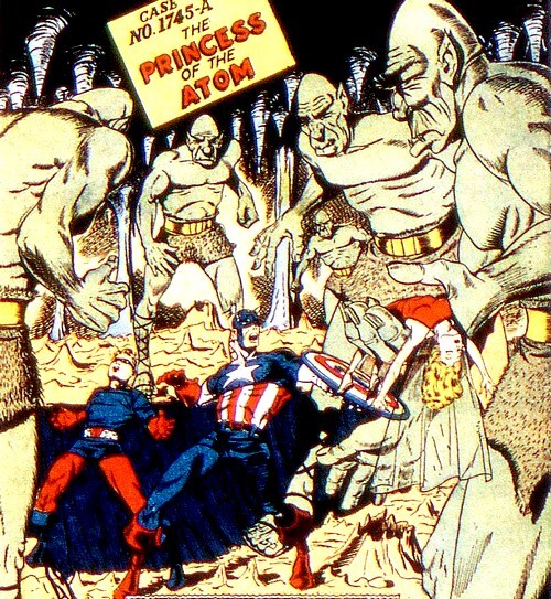А названия всё оригинальнее и оригинальнее (хотя мало что может переплюнуть Монстра из Морга из прошлой подборки). Вот первая история в комиксе Captain America Comics #25 называется «Принцесса Атома». Увольнительную Стив Роджерс и Бакки решают провести с другом Стива, Фрэнком Феррулом, и его сестрой, Дианой, на острове. Как назло, на острове начинает твориться чертовщина – объявляются великаны, Диана пропадает, странный мужчина предупреждает Стива и Бакки держаться от острова подальше, и, разумеется, Капитан Америка и Бакки идут исследовать остров. И находят они Диану, и та объясняет, что на самом деле не является сестрой Фрэнка, а является принцессой мини-мира, расположенного на атоме одного из местных булыжников, и родители отправили её в большой внешний мир, чтобы спасти от узурпатора Тогаро, который хочет её убить. Великаны – это прихвостни Тогаро, который наложил лапы на зелье изменения размера. Раз так, Кэп и Бакки уменьшаются с помощью зелья и отправляются в мини-мир, оставив булыжник под охраной людей, которым приказывают поливать кислотой прихвостней Тогаро, если те начнут из булыжника выползать. Но прихвостни Тогаро застают людей врасплох, и бутылка с кислотой переворачивается и обливает камень! Волна кислоты вот-вот убьёт Кэпа и Бакки!