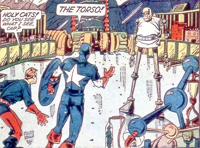 А я перехожу к комиксу Captain America Comics #28 и истории под названием «Челлендж бешеного туловища». Ага, да. В Берлине Гитлер, Муссолини и Хирохито вскладчину нанимают опаснейшего наёмника по прозвищу «Туловище» (или, если короче, «Торс»), чтобы тот убил, наконец, Капитана Америку. Торс довольно быстро вычисляет личность Капитана Америки (но никому не говорит, чтобы не делиться наградой), и вместо того, чтобы тихо убить рядового Роджерса и «сына полка» Барнса ночью, через письмо выдвигает им челлендж. Расследуя оставленные Торсом улики, сражаясь с его прихвостнями и попадая в одну ловушку за другой, герои находят базу Торса в горах. Сам Торс оказывается киборгом – человеческое туловище с механическими руками и ногами. Он долбанулся, когда потерял на войне все лапки, и теперь собирается сначала наказать Америку, а затем уничтожить всё человечество и заменить его собственноручно выведенной расой уродов. Ну, тут разговор короткий. По результатам сражения Торс падает насмерть с обрыва, а его база с заготовленными уродами взрывается.