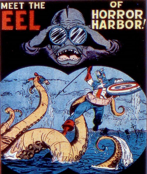 Во второй истории Человек-Факел и Торо останавливают саботажника, который хотел подорвать уже почти достроенный монумент с лицами президентов на горе Рашмор (саботажник подрывается на собственном динамите), а в истории «Угорь из Гавани Ужаса» Капитан Америка и Бакки Барнс расследуют случаи саботажа на местной верфи. Оказывается, суперзлодей в костюме рыбочеловека, зовущий себя Угрём, приказывает своим бойцам обмазывать корабли рыбьим жиром. Это привлекает огромного осьминога, который топит корабли. Есть выход! Кэп и Бакки, надев водолазные шлемы а-ля Биошок (вот нравится мне видеть в комиксах такие вот указания на текущий уровень техники. То Бэтмэн пользуется старинным телефоном с горизонтльной трубкой, то до-Кустовские водолазные костюмы о Биошоке напоминают), заманивают большого осьминога в пещеру, кишащую электрическими угрями. Осьминог погибает, а Кэп и Бакки выбираются и устраивают Угрю экстремальный массаж лица и тела, после чего сдают его и приспешников властям.