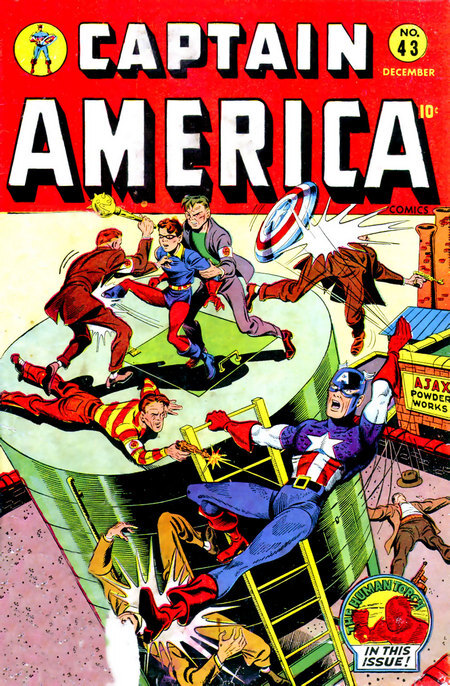 В общем, давайте уже перейдём к комиксу Captain America Comics #43. История с оптимистичным названием «Тени Смерти» начинается с того, что в небольшом захолустном городке начинают происходить таинственные убийства, очевидцы утверждают, что видели огромную зловещую тень. Местный житель уверен, что это дело рук ожившего монстра с картины его дяди. Капитан Америка и Бакки берутся за расследование! И расследование приводит их к выводу, что нацисты вновь дурят людей, создав «монстра», чтобы запугать жителей городка и получить доступ к шахтам, где добывается редкий минерал. «Теневым монстром» оказывается сторонник нацистов, и сдаваться властям он не намерен – вместо этого он в своём грузовике выруливает с обрыва. Насмерть. Во второй истории Человек-Факел и Торо расследуют «Загадку бескрылого нетопыря». Просто объявился нацист, зовущий себя Герром Нетопырём, но до Бэтмэна ему далеко, и даже асбестовые смирительные рубашки, надетые на пламенных героев, не спасают Нетопыря от горячей справедливости – Нетопырь и его бойцы подрываются на своих же бомбах.