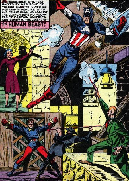 В третьей истории немецкий самолёт терпит крушение на болоте, спасаясь от американских истребителей. Как ни странно, пилотам удаётся выжить...и один из немцев, Ганс, под воздействием болотного газа мутирует, став большим и тупым. Второй немец, фон Каулюс, решает этим воспользоваться. Вскоре Капитан Америка и Бакки узнают о «болотном чудище», которое нападает на расположенную неподалёку фабрику по сборке бомбардировщиков. При личной встрече «Ганс» нокаутирует Кэпа. И убил бы, не будь Капитан Америка суперсолдатом! А так Кэп выжил. Поняв, что с ним лучше не связываться, Каулюс и Ганс угоняют самолёт и сваливают, Кэп и Бакки – за ними, во втором самолёте. Тогда, по приказу Каулюса, «болотное чудище» прыгает на самолёт Кэпа и пытается оторвать Капитану башку и все лапки. Но Кэп и Бакки просто десантируются, а их самолёт (с чудищем) врезается в самолёт Каулюса. Оба злодея гибнут, а герои безопасно приземляются. В последней же истории Капитан Америка сталкивается с Женщиной-Кошкой (ага, выкуси, DC). Впрочем, она не такая стильная, как та Кошка, которая мурчит Тёмному Рыцарю, да и любовной истории очаровательной злодейки с неподкупным героем не будет – спасаясь от Капитана Америки в своём автомобиле, Женщина-Кошка наматывается на столб, погибнув на месте.