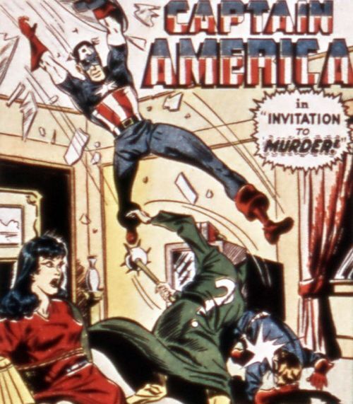 Погоревав о Кошке, переходим к комиксу Captain America Comics #46, который начинается с истории под названием «Приглашение к убийству». Помер местный богач и завещал разделить своё имущество по слугам и родственникам, и если кто-то из наследников помрёт, его часть наследства следует разделить между выжившими. Да это же, по сути, приглашение к убийству! И начинается грызня между родственниками...Стив и Бакки оказываются в неё втянуты случайно – их джип сломался и они попросились в поместье переночевать. Капитан Америка берётся расследовать убийства и покушения (основные подозреваемые – брат и племянник покойного богача), и в определённый момент выясняет, что за убийствами и покушениями стоят вовсе не те, кого он подозревал, а жена и адвокат богача. В финальном сражении адвокат случайно всаживает пулю в жену богача, Кэп вместе с ним падает с обрыва в реку...но переживает падение только сам Капитан Америка. А брат и племянник богача жертвуют свои доли наследия на нужды армии. Человек-Факел и Торо во второй истории ловят немецких шпионов по списку, ничего особенного.